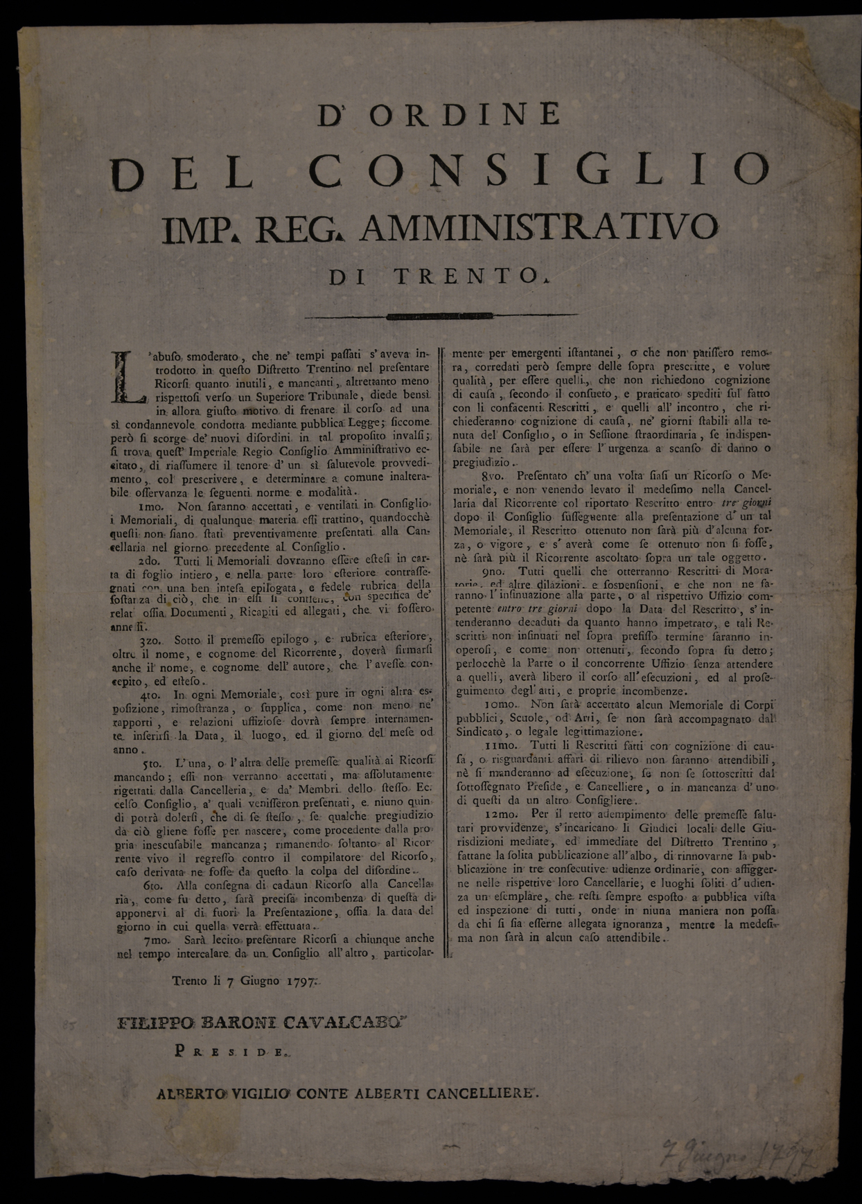 1 manifesto. Proclama sui ricorsi amministrativi emanato il 7 giugno 1797 dall’Imperial regio consiglio amministrativo di Trento, stampa attribuibile alla tipografia Monauni di Trento in base al raffronto di caratteri e fregi