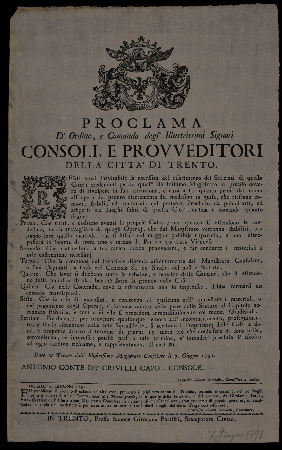 Proclama sul rifacimento dei selciati emanato il 7 giugno 1791 dal Magistrato consolare di Trento, stemma del Magistrato consolare di Trento.