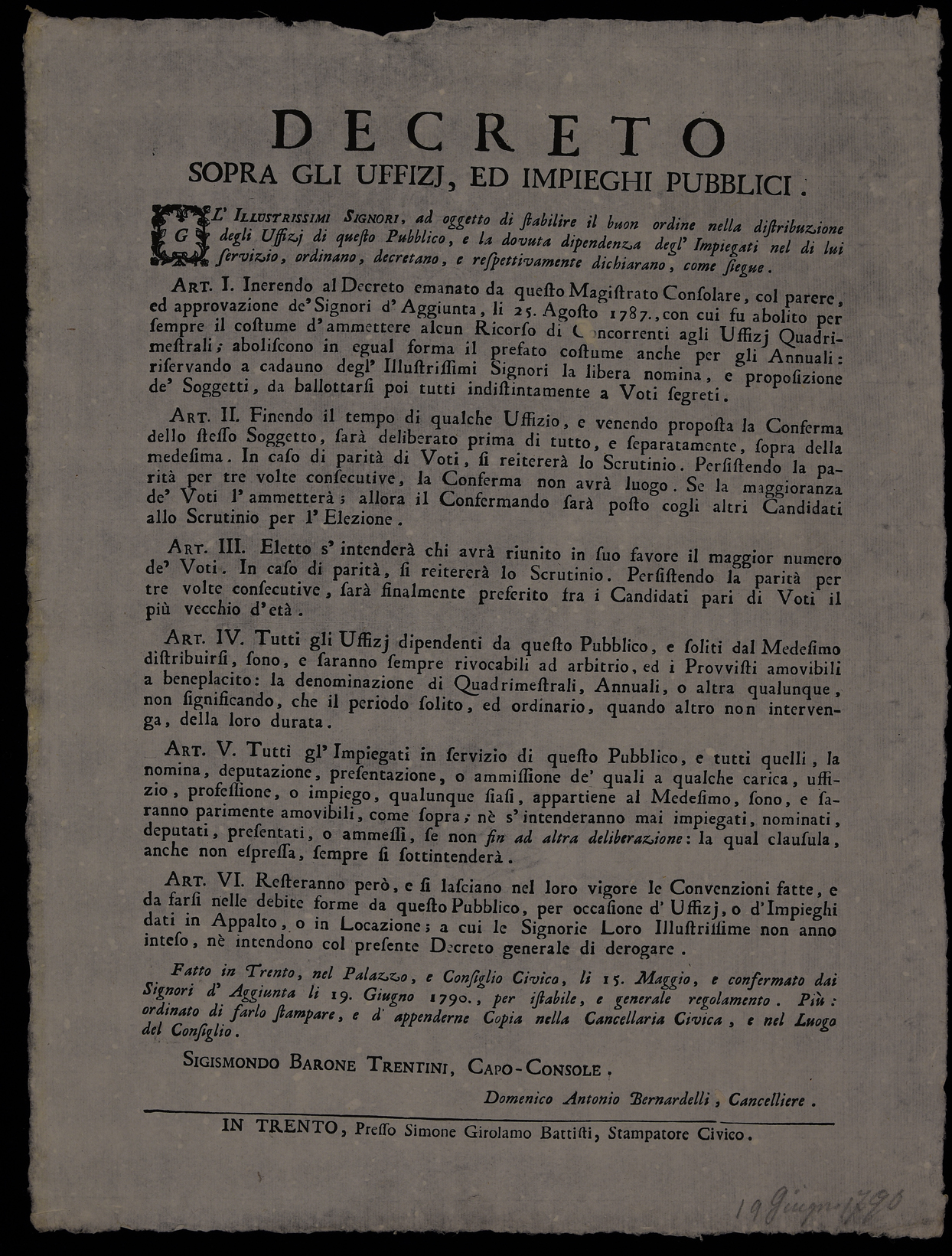 Proclama che regolamenta l'accesso alle cariche pubbliche emanato il 19 giugno 1790 dal Magistrato consolare di Trento.