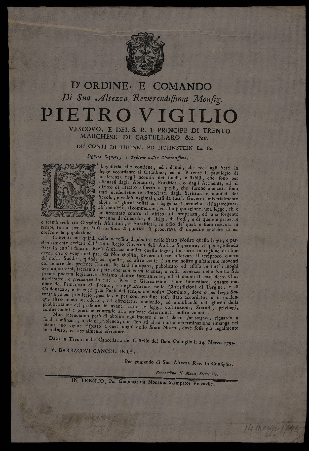 Proclama sull'abrogazione delle leggi che permettono l'alienazione dei beni fondiari emanato il 14 marzo 1794 da Pietro Vigilio Thun, principe-vescovo di Trento, stemma di Pietro Vigilio Thun.