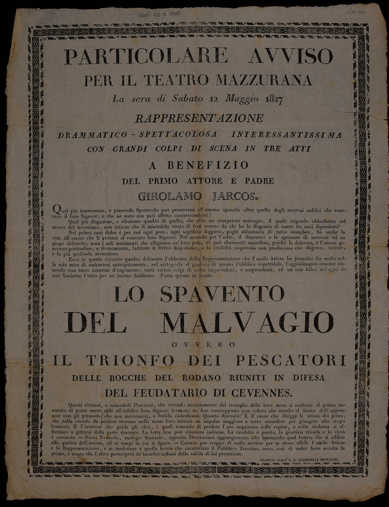 | Particolare avviso per il teatro Mazzurana, la sera di sabato 12 maggio 1827 rappresentazione drammatico-spettacolosa interessantissima con grandi colpi di scena in tre atti a benefizio del primo attore e padre Girolamo Jarcos. Lo spavento del malvagio, ovvero il trionfo dei pescatori delle bocche del Rodano riuniti in difesa del feudatario di Cevennes |