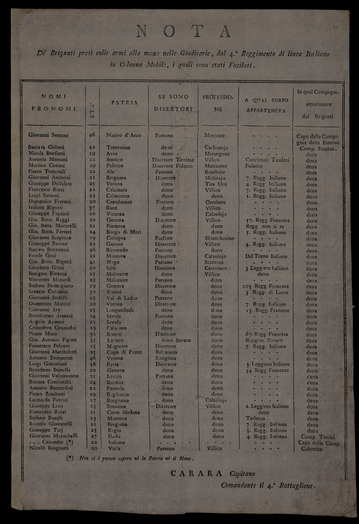 Nota de' briganti presi colle armi alla mano nelle Giudicarie, dal 4°...