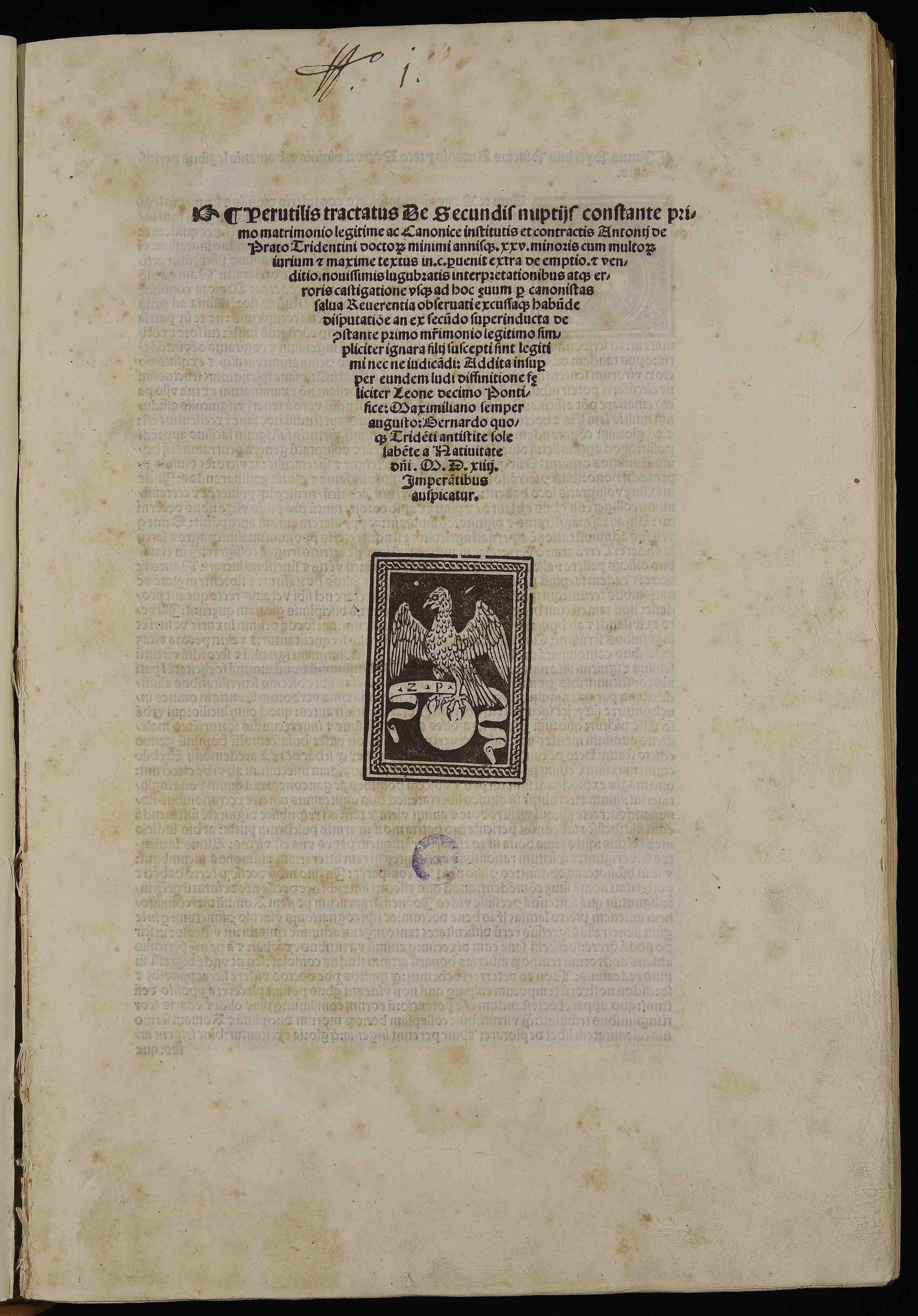 | Perutilis tractatus de secundis nuptiis constante primo matrimonio legitime ac canonice institutis et contractis Antonii de Prato Tridentini doctorum minimi annisque XXV minoris cum multorum iurium et maxime textus in c. pervenit extra de emptio et venditio novissimis lugubratis interpretationibus Addita insuper per eundem ludi diffinitione feliciter Leone decimo Pontifice, Maximiliano semper augusto, Bernardo quoque Tridenti antistite sole labente a Nativitate domini MDxiiii imperantibus auspicatur |