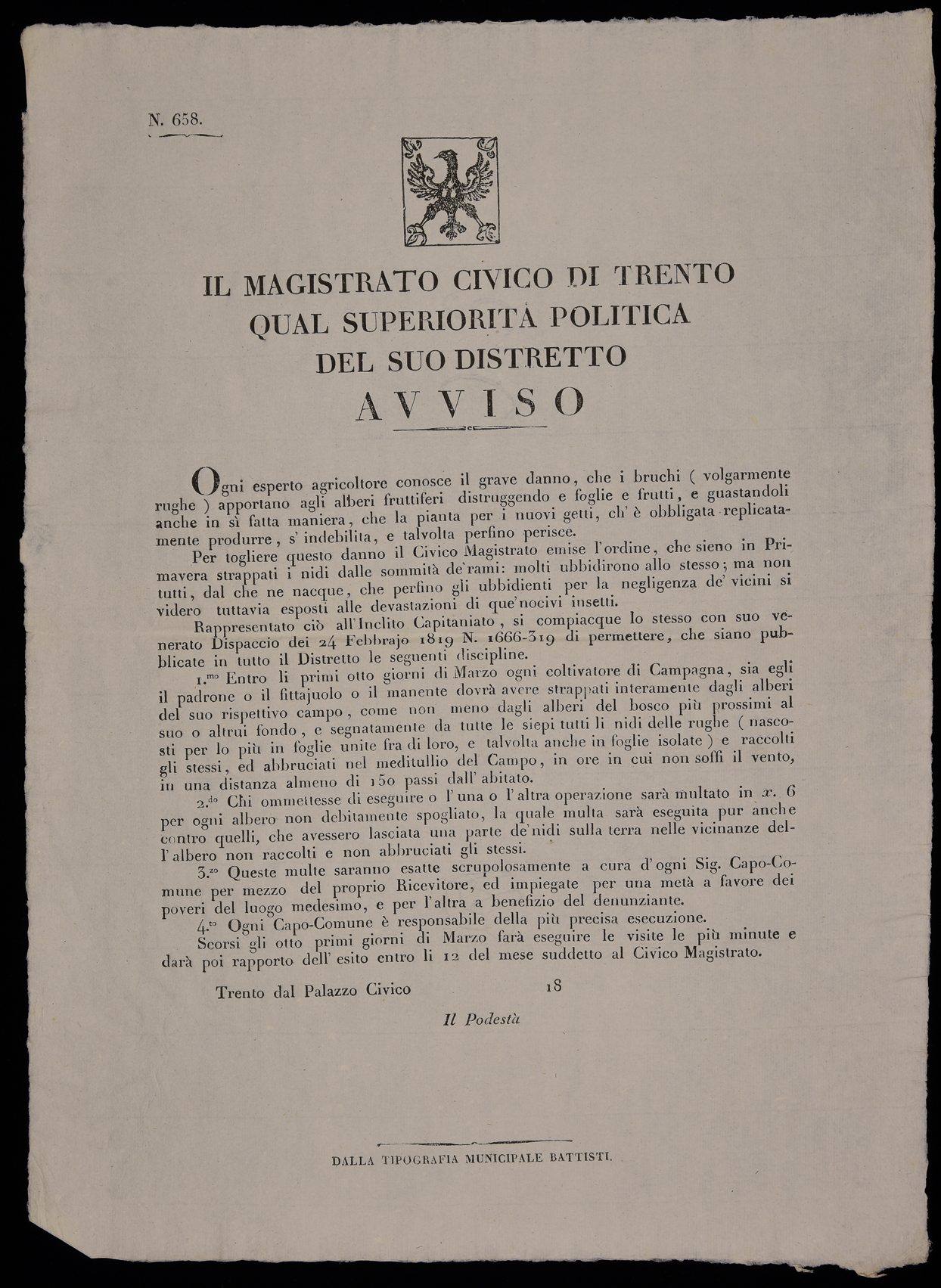 | Il Magistrato civico di Trento qual superiorità politica del suo distretto. Avviso |