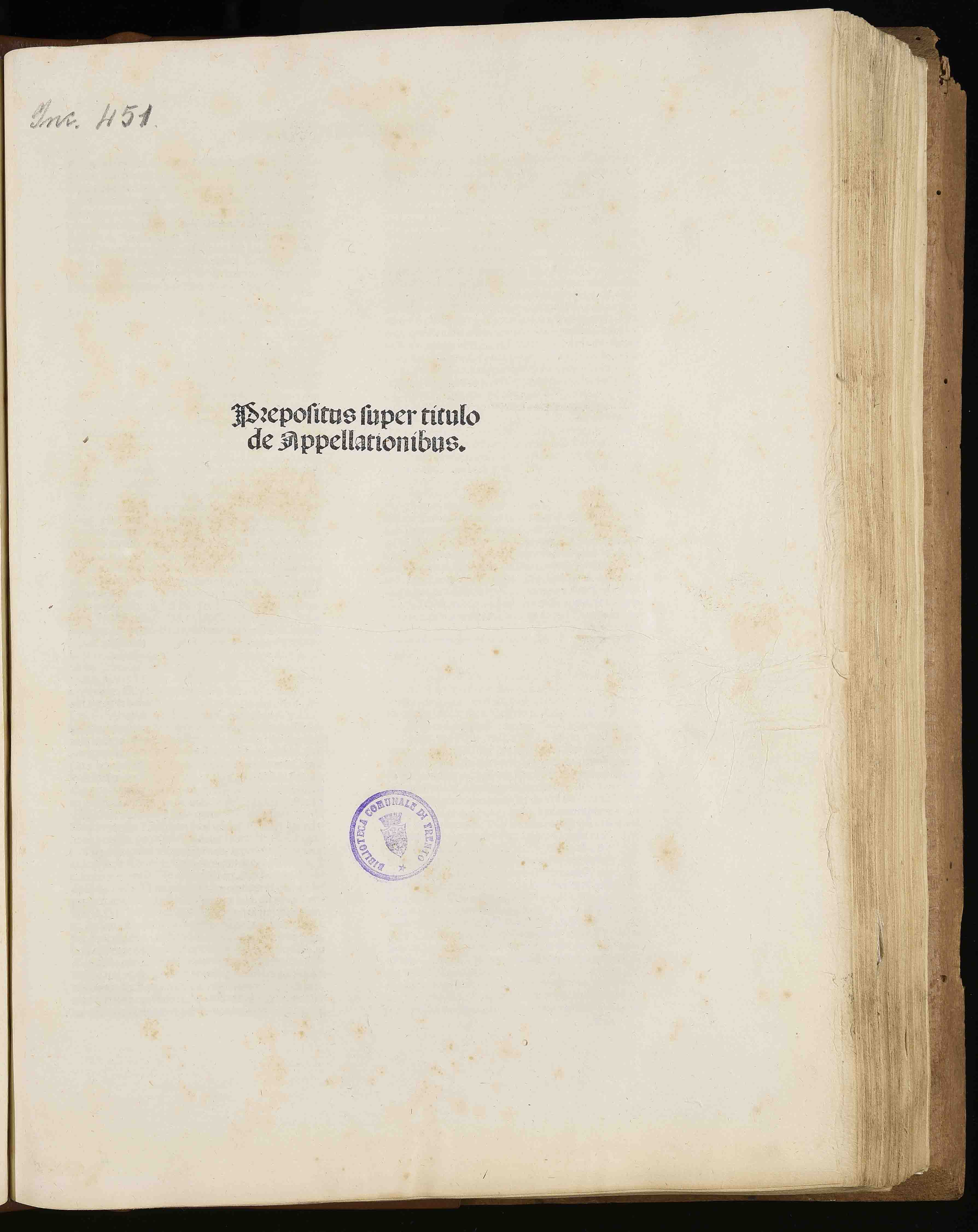 Appartenuto al vescovo Bernardo Cles (cfr. Biblioteca del cardinale 1985 , scheda 227) e alla Biblioteca vescovile (Borzatti , p. 111; (cfr. Hausbergher 2001 , scheda 319 e Incunaboli della Biblioteca comunale 2006 , scheda 232), il volume fu trasportato nel 1810 presso il Seminario vescovile e passò quindi alla Biblioteca comunale.