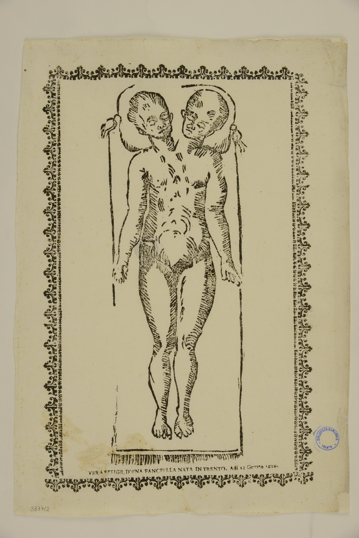 Il manifesto ritrae l'immagine di una neonata, venuta alla luce a Trento il 23 gennaio 1620 con due teste.
