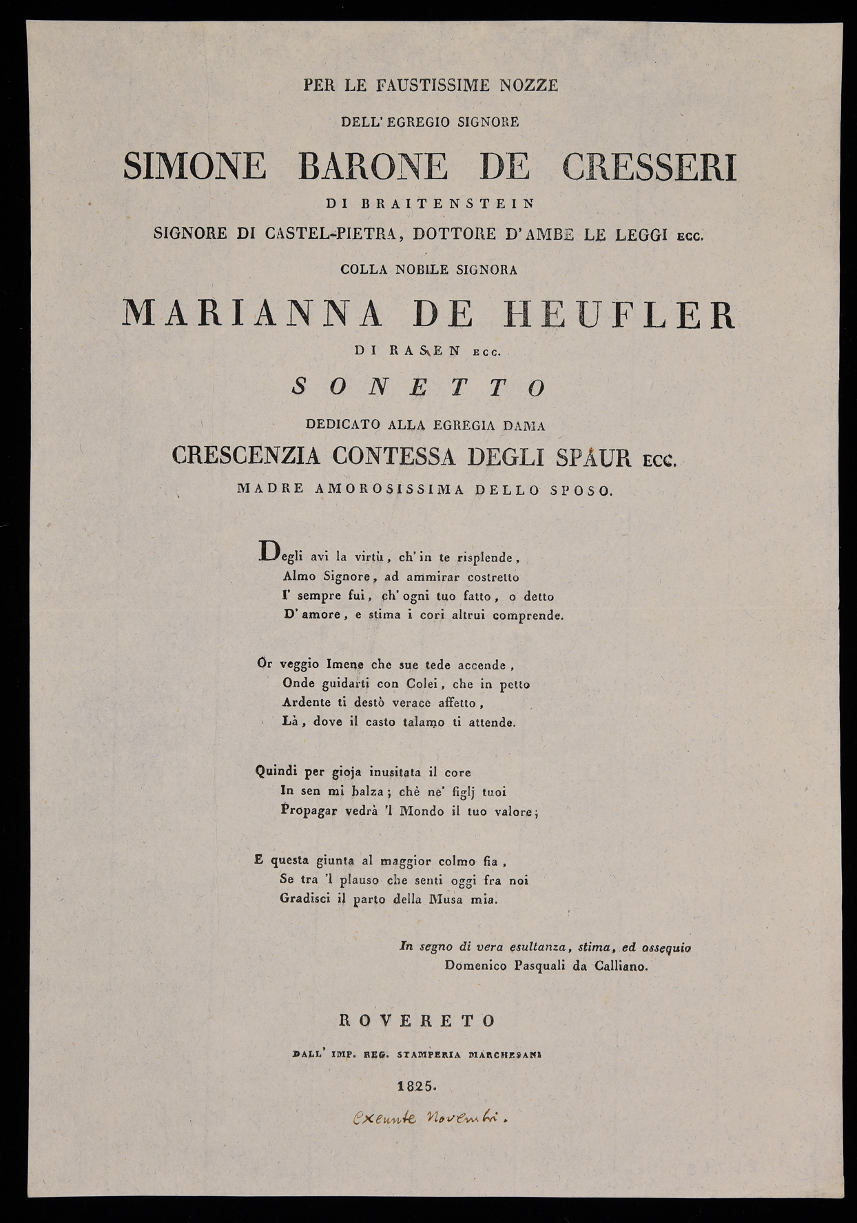| Per le faustissime nozze dell'egregio signore Simone barone de Cresseri di Braitenstein signore di Castel-Pietra, dottore d'ambe le leggi ecc. colla nobile signora Marianna de Heufler di Rasen ecc., sonetto dedicato alla egregia dama Crescenzia contessa degli Spaur ecc. madre amorosissima dello sposo |