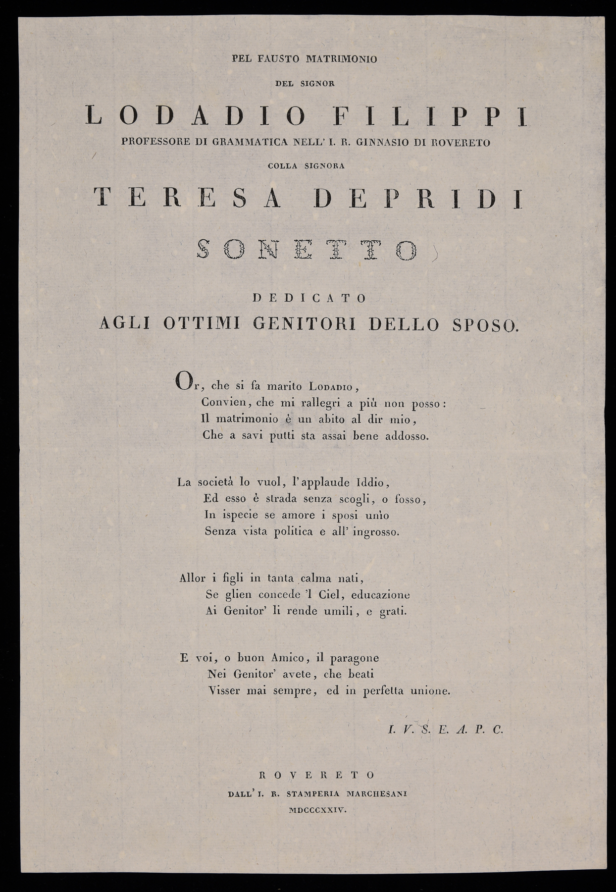 | Pel fausto matrimonio del signor Lodadio Filippi professore di grammatica nell'I.R. ginnasio di Rovereto colla signora Teresa Depridi, sonetto dedicato agli ottimi genitori dello sposo |