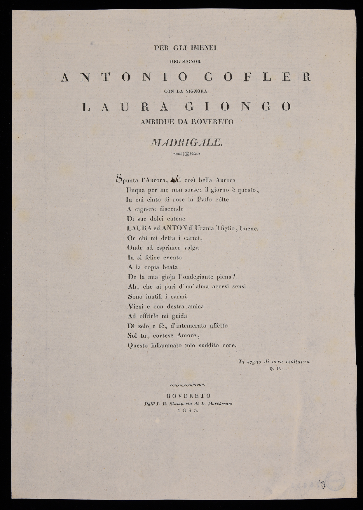 | Per gli imenei del signor Antonio Cofler con la signora Laura Giongo, ambidue da Rovereto, madrigale |
