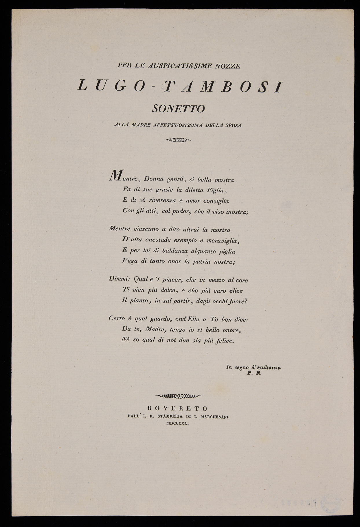 | Per le auspicatissime nozze Lugo-Tambosi, sonetto alla madre affettuosissima della sposa |