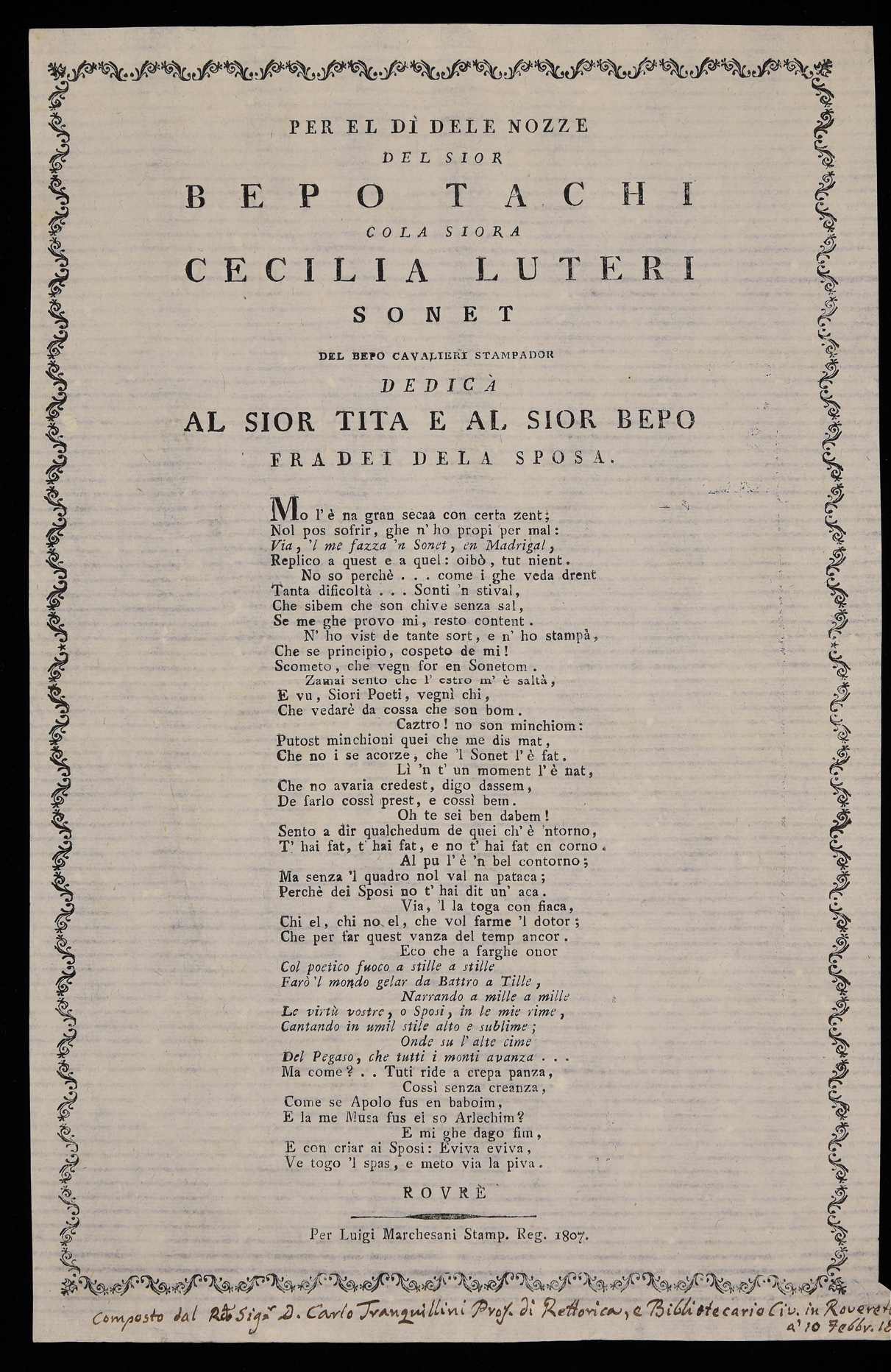 | Per el dì dele nozze del sior Bepo Tachi cola siora Cecilia Luteri, sonet del Bepo Cavalieri dedicà al sior Tita e al sior Bepo fradei dela sposa |