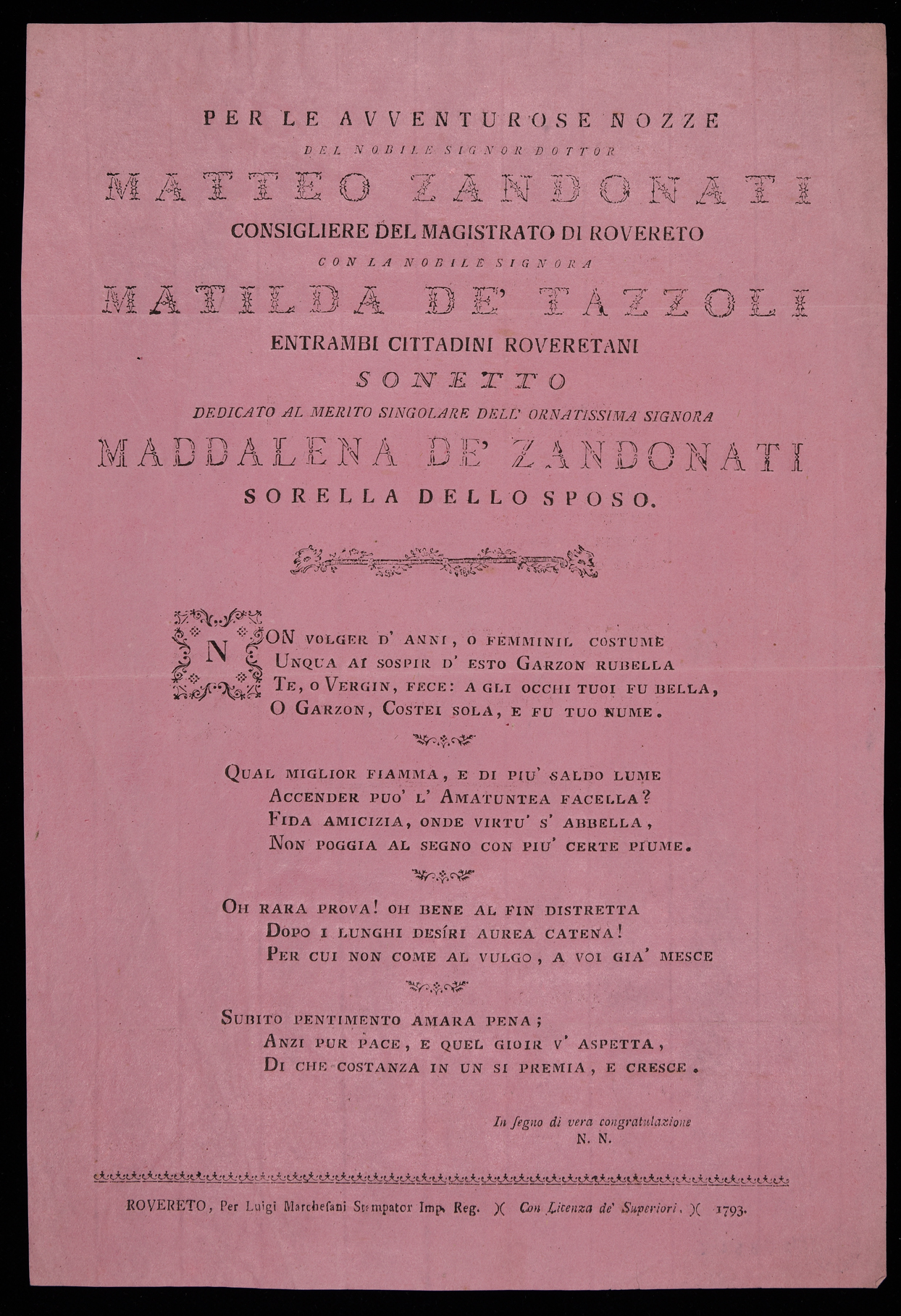 | Per le avventurose nozze del nobile signor dottor Matteo Zandonati consigliere del magistrato di Rovereto con la nobile signora Matilda de' Tazzoli entrambi cittadini roveretani, sonetto dedicato al merito singolare dell'ornatissima signora Maddalena de' Zandonati sorella dello sposo |