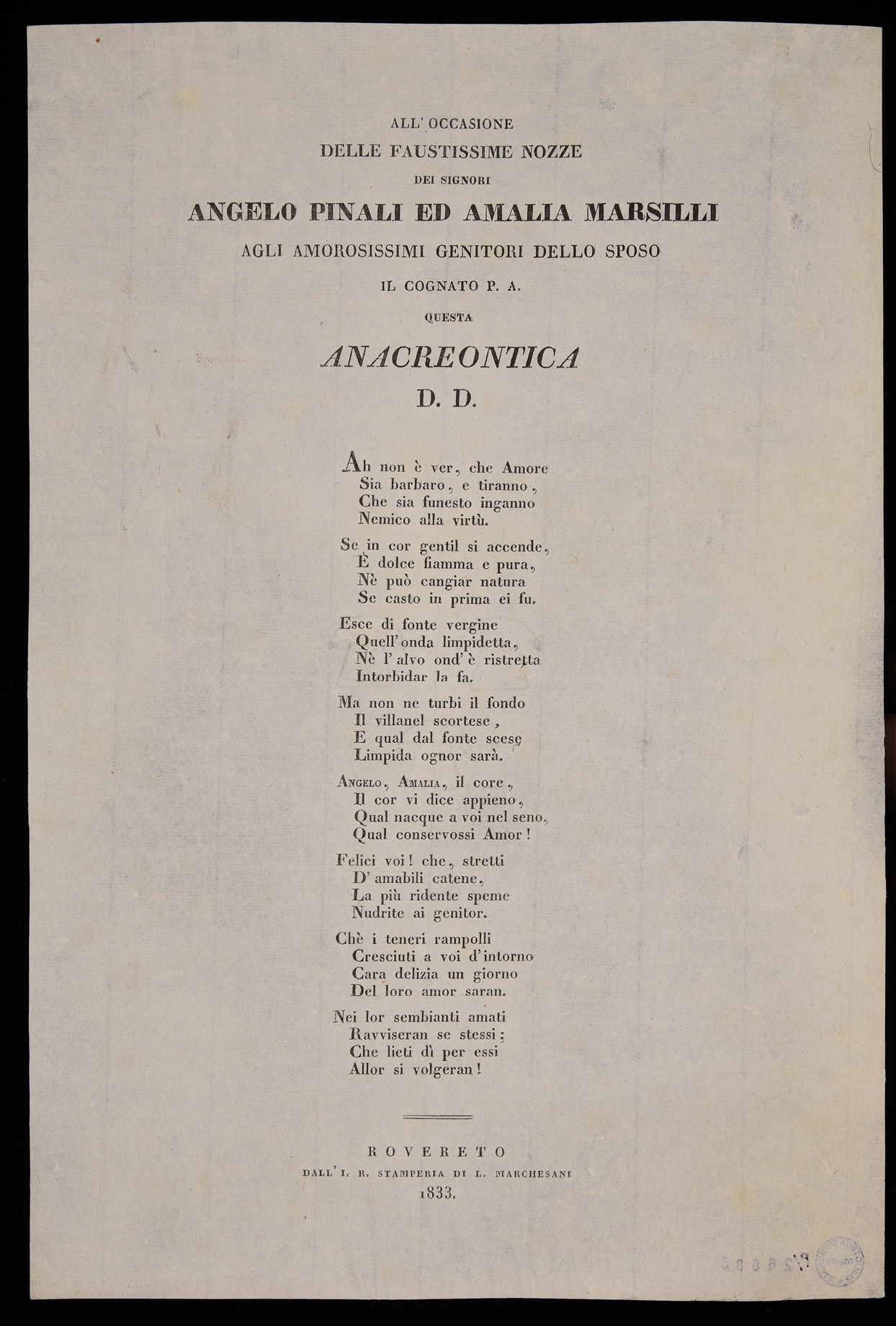 | All'occasione delle faustissime nozze dei signori Angelo Pinali ed Amalia Marsilli agli amorosissimi genitori dello sposo il cognato P.A. questa anacreontica D.D. |