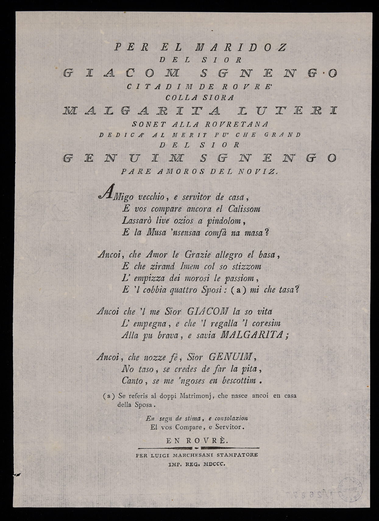 | Per el maridoz del sior Giacom Sgnengo citadim de Rovré colla siora Malgarita Luteri sonet alla rovretana dedicà al merit pù che grand del sior Genuim Sgnengo pare amoros del noviz |