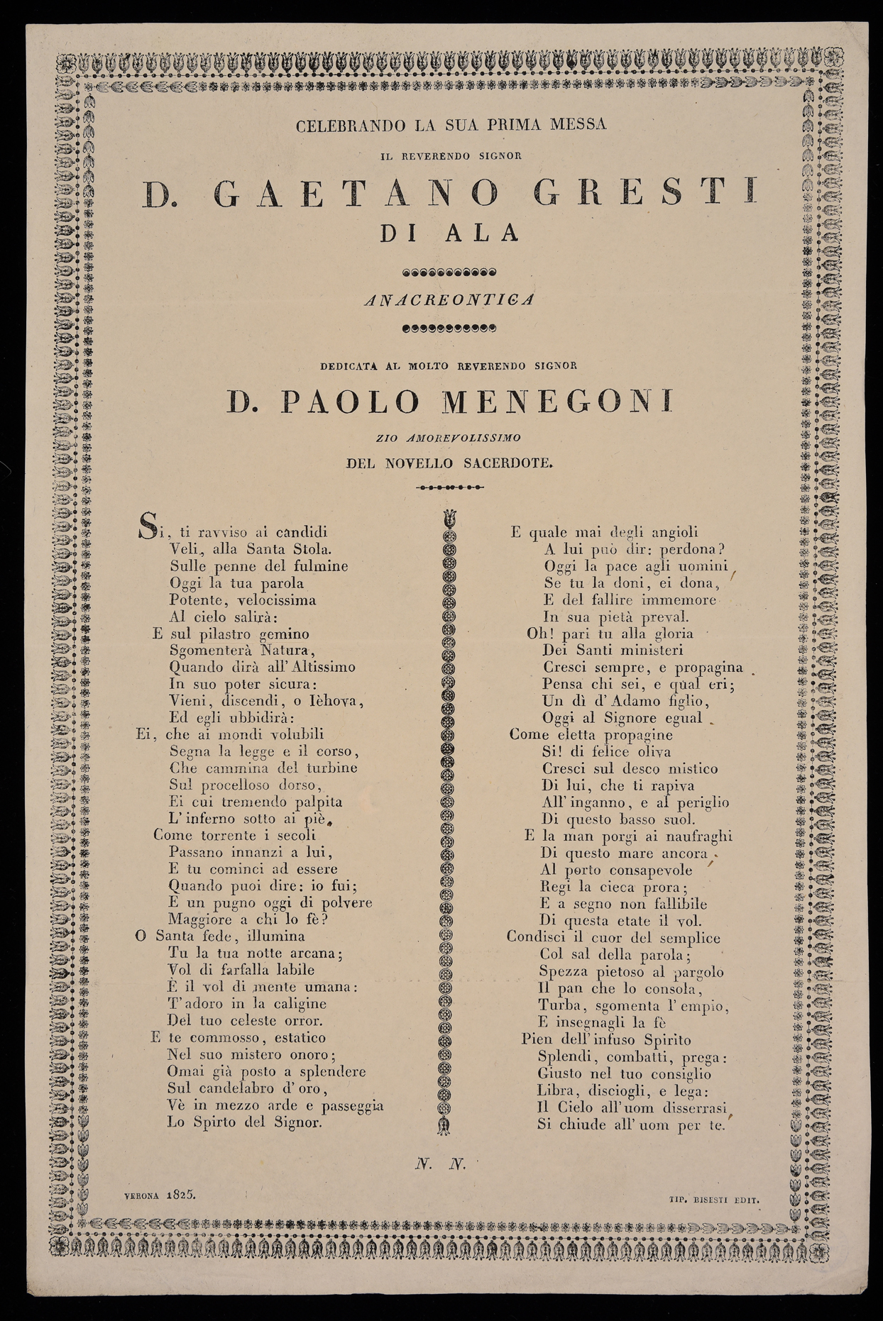 | Celebrando la sua prima messa il reverendo signor d. Gaetano Gresti di Ala, anacreontica dedicata al molto reverendo signor d. Paolo Menegoni zio amorevolissimo del novello sacerdote |