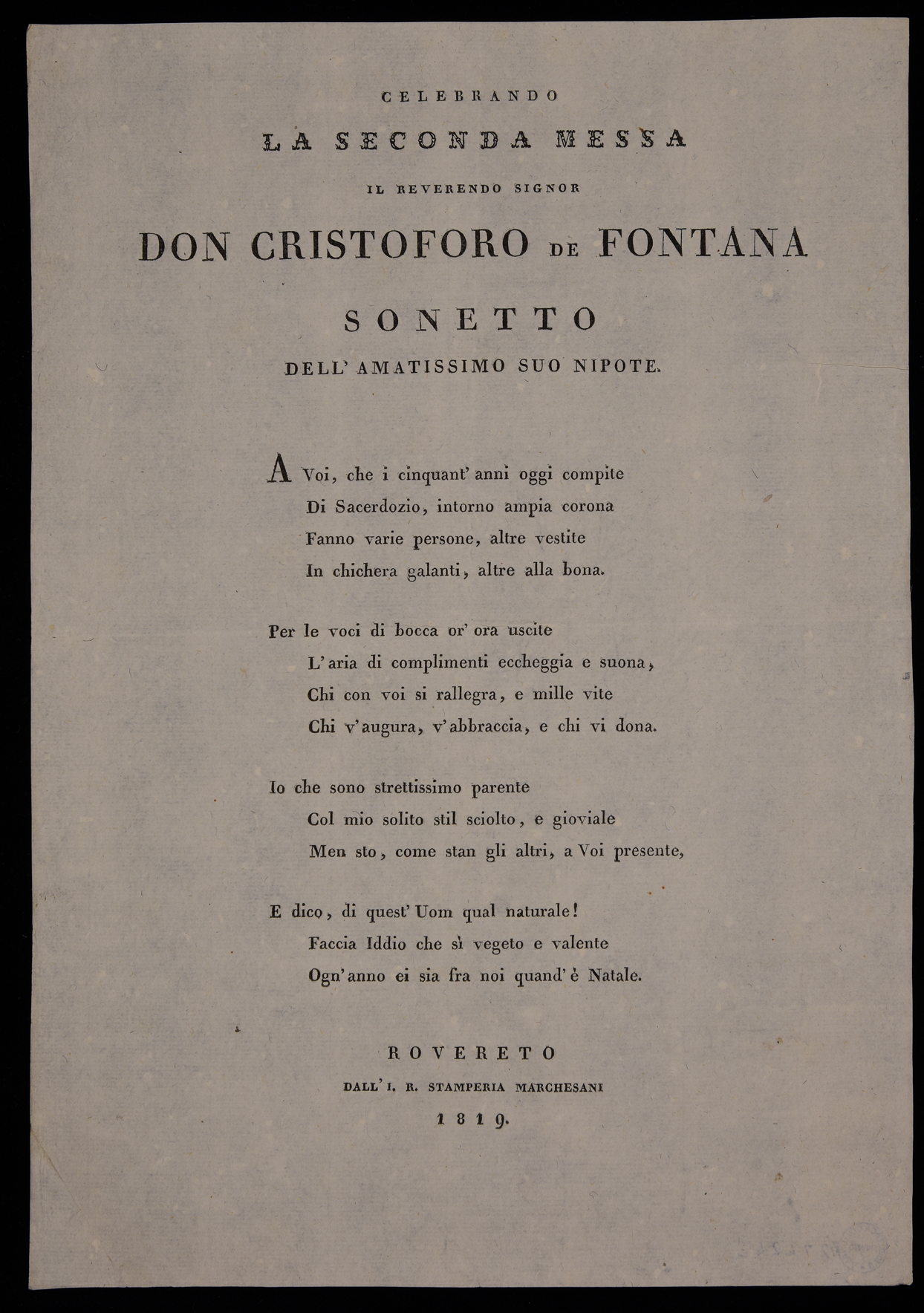 | Celebrando la seconda messa il reverendo signor don Cristoforo de Fontana, sonetto dell'amatissimo suo nipote |