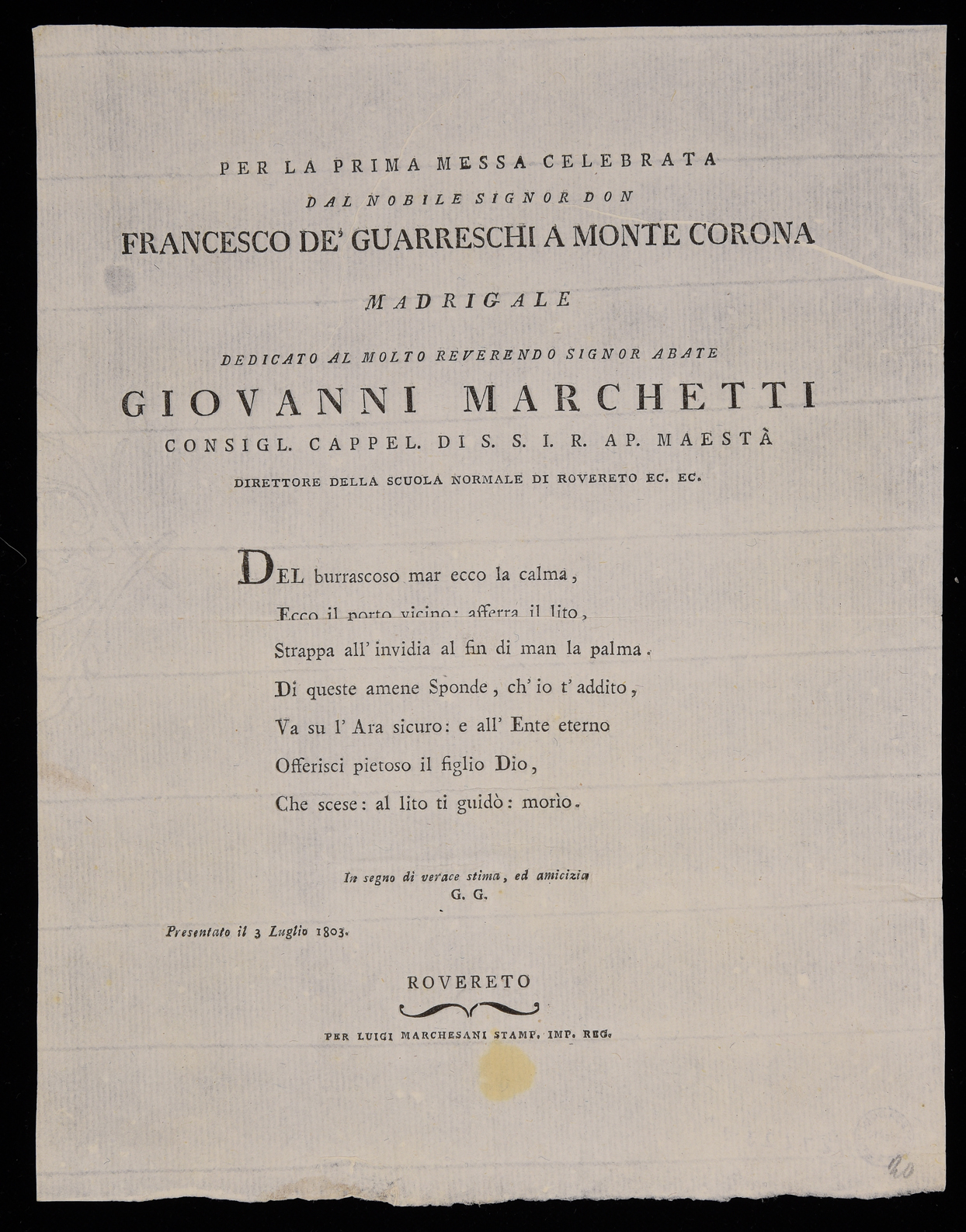 | Per la prima messa celebrata dal nobile signor don Francesco de' Guarreschi a Monte Corona, madrigale ... |