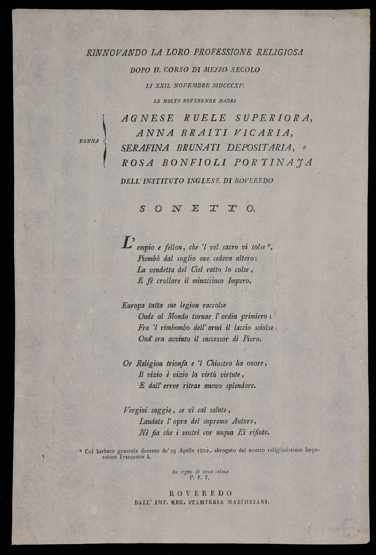 | Rinnovando la loro professione religiosa dopo il corso di mezzo secolo li XXII. novembre ... sonetto |