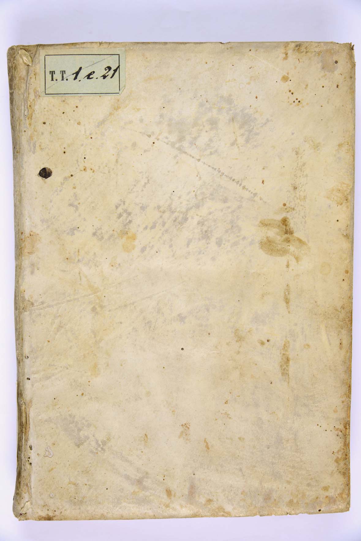L’esemplare è mutilo di c. a3, numerosi segni di attenzione a matita nei margini e numerose sottolineature a matita, particolarmente frequenti alle cc. G8-H7, nota illeggibile a matita nel margine di c. H5v. Timbro della Biblioteca al frontespizio (inchiostro nero, tipo A), ex libris della Biblioteca (tipo A) sul verso del piatto anteriore. Legatura in pergamena all’olandese, titolo manoscritto sul dorso, 1 carta di guardia (ant. e post., con filigrana raffigurante una balestra), mm. 230x160x35. Antiche segnature di collocazione: 5678 (sul dorso, Mazzetti), T T 1 e 21 (Biblioteca comunale di Trento). Numero d’inventario della Biblioteca comunale di Trento: x/1465 a c. 2H3r.