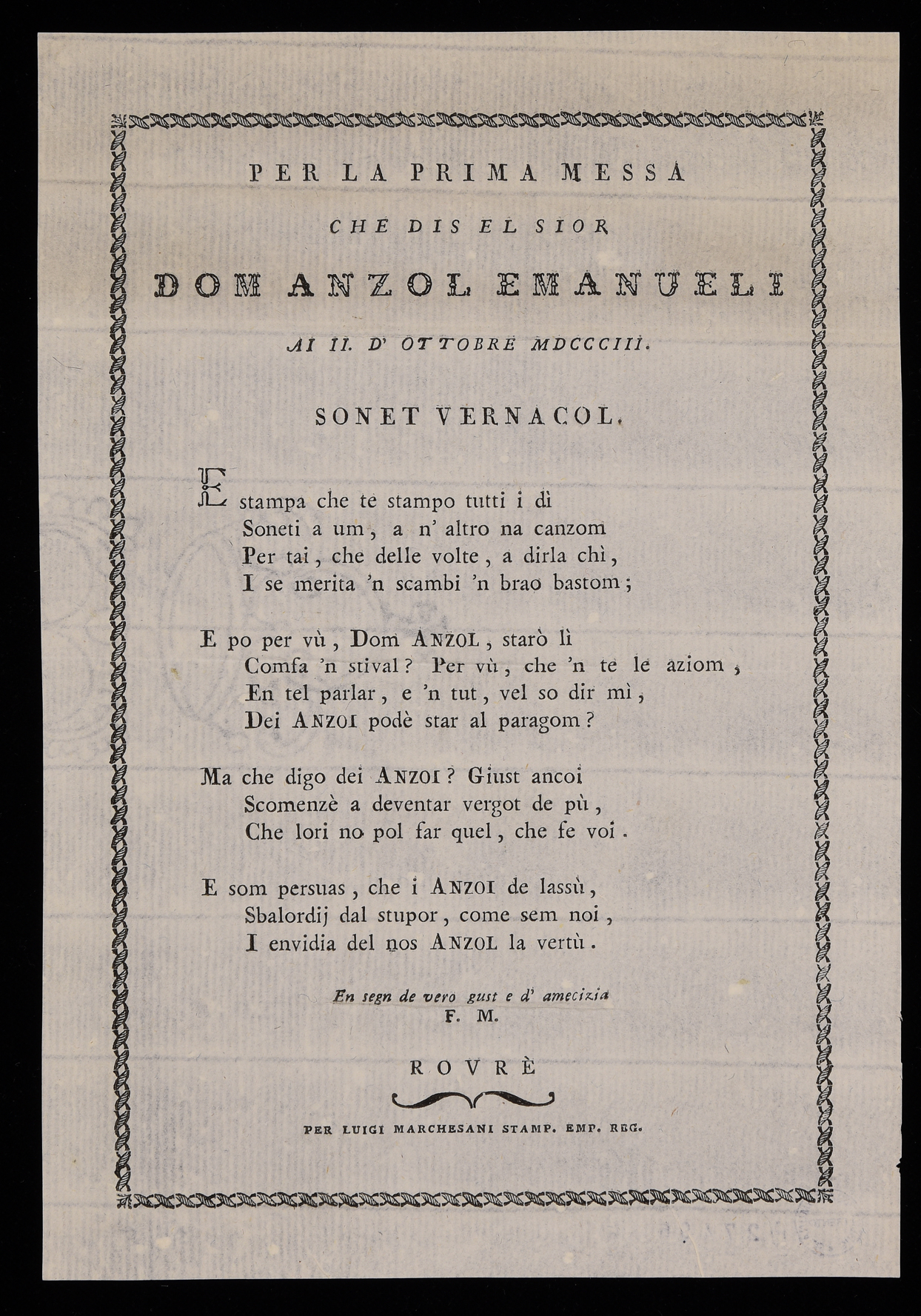 | Per la prima messa che dis el sior dom Anzol Emanueli ai II. d'ottobre MDCCCIII., sonet vernacol |