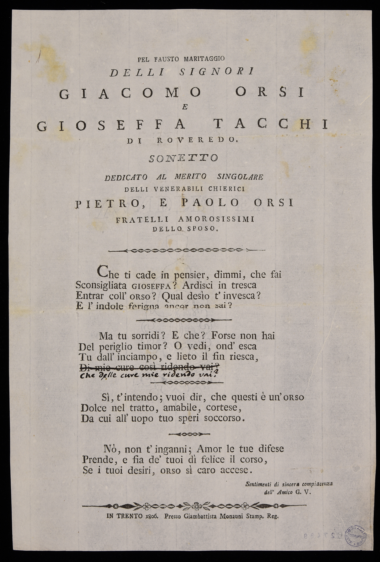 | Pel fausto maritaggio delli signori Giacomo Orsi e Gioseffa Tacchi di Roveredo, sonetto dedicato al merito singolare delli venerabili chierici Pietro, e Paolo Orsi fratelli amorosissimi dello sposo |