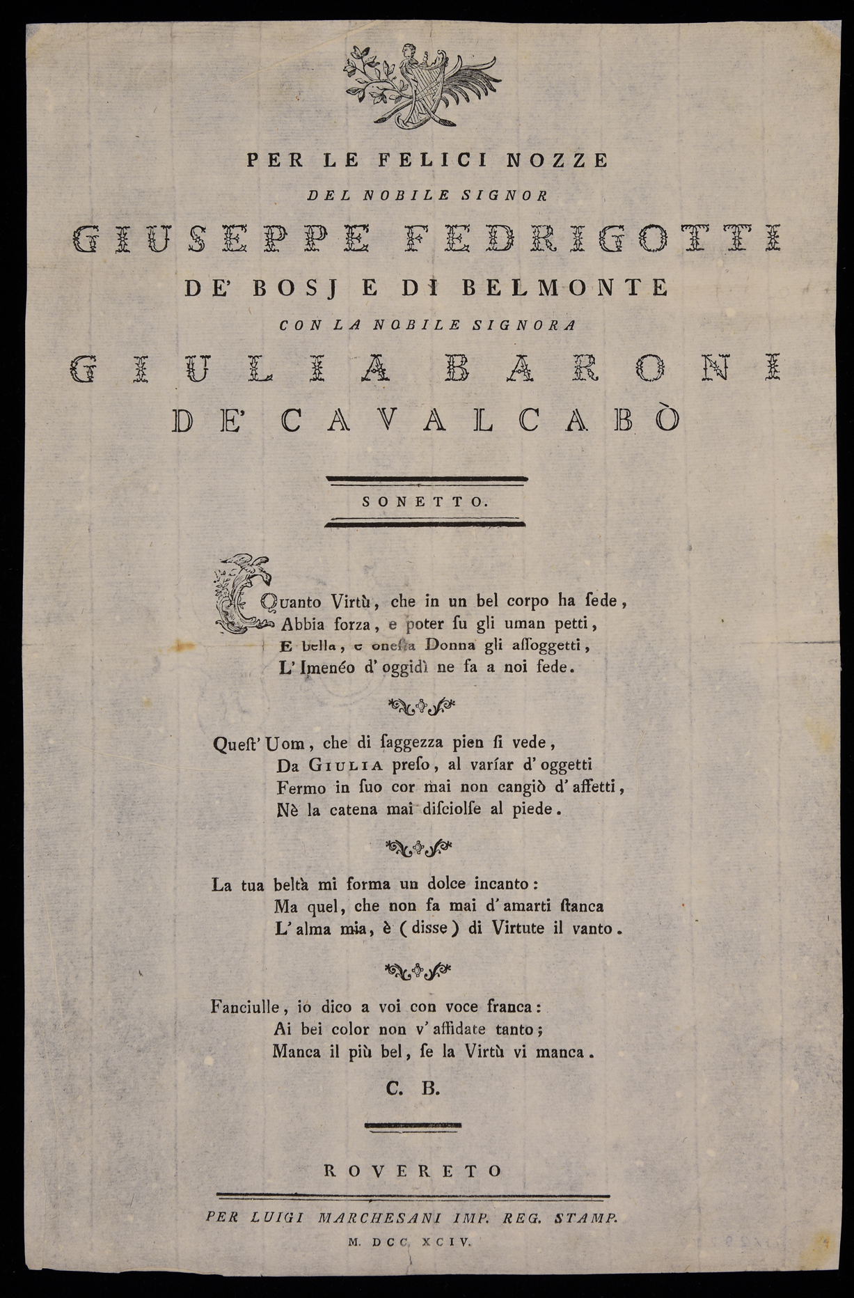 | Per le felici nozze del nobile signor Giuseppe Fedrigotti de' Bosj e di Belmonte con la nobile signora Giulia Baroni de' Cavalcabò, sonetto |