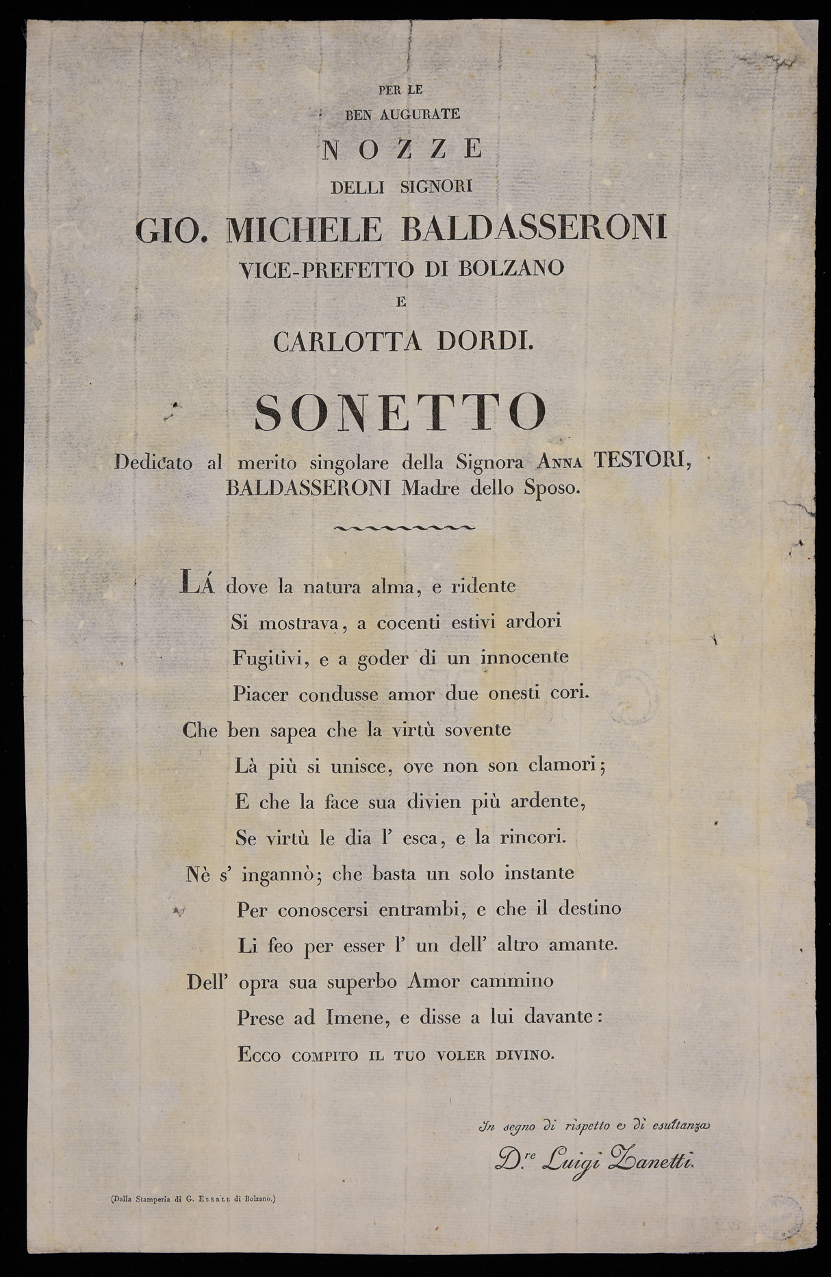 | Per le ben augurate nozze delli signori Gio. Michele Baldasseroni vice-prefetto di Bolzano e Carlotta Dordi, sonetto dedicato al merito singolare della signora Anna Testori, Baldasseroni madre dello sposo |
