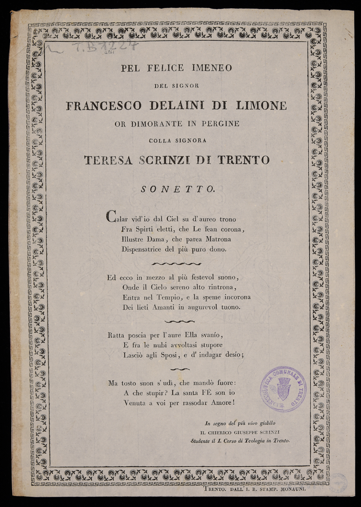 | Pel felice imeneo del signor Francesco Delaini di Limone or dimorante in Pergine colla signora Teresa Scrinzi di Trento, sonetto |