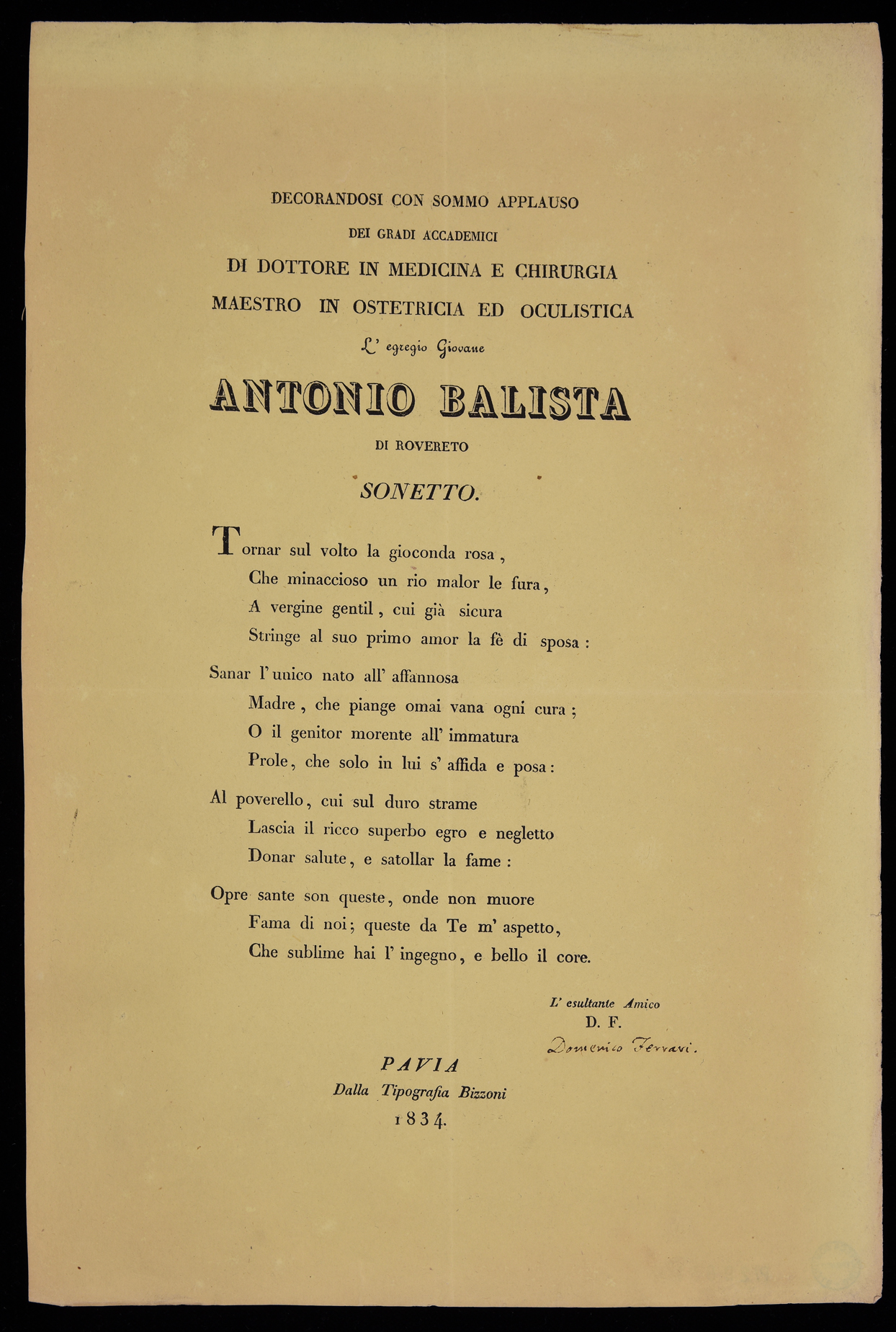 | Decorandosi con sommo applauso dei gradi accademici di dottore in medicina e chirurgia ... Antonio Balista di Rovereto, sonetto |