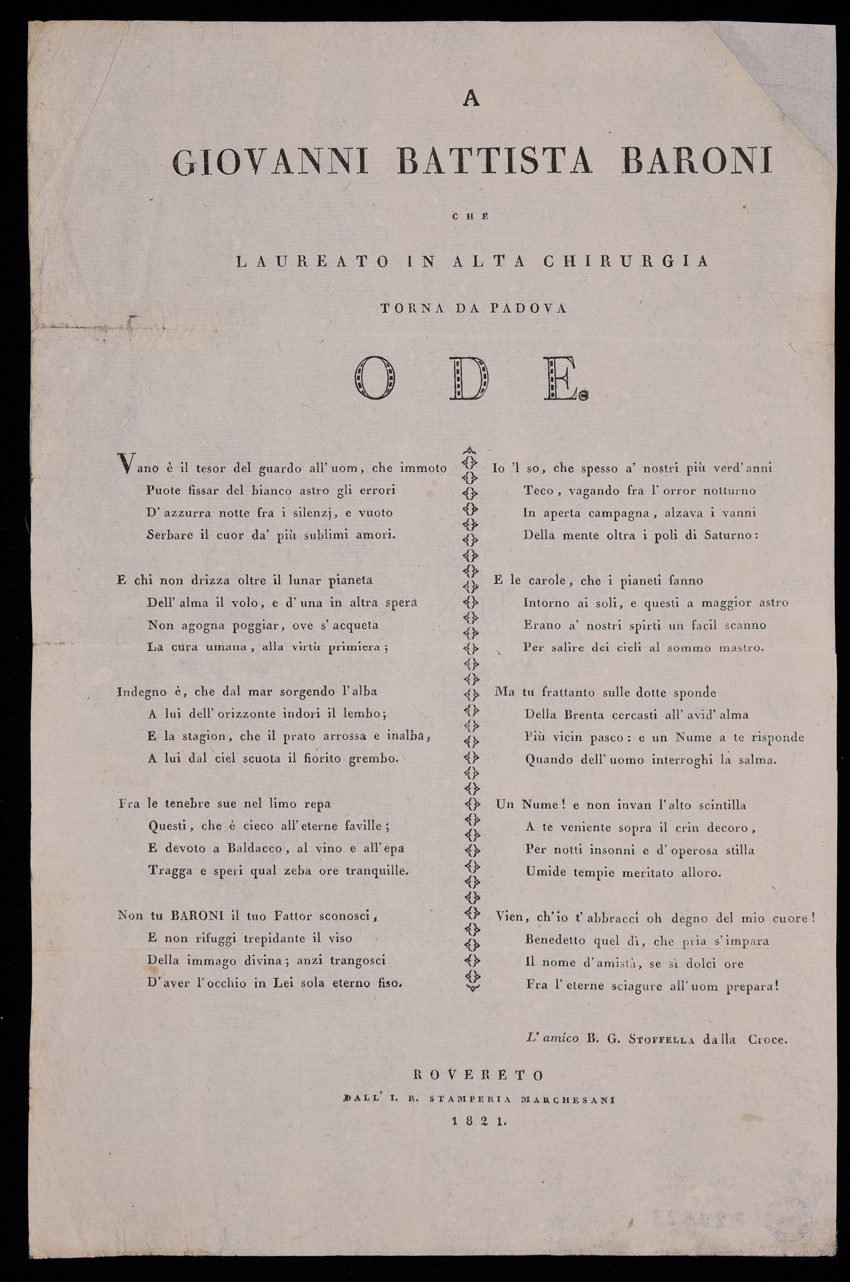 | A Giovanni Battista Baroni che laureato in alta chirurgia torna da Padova, ode |