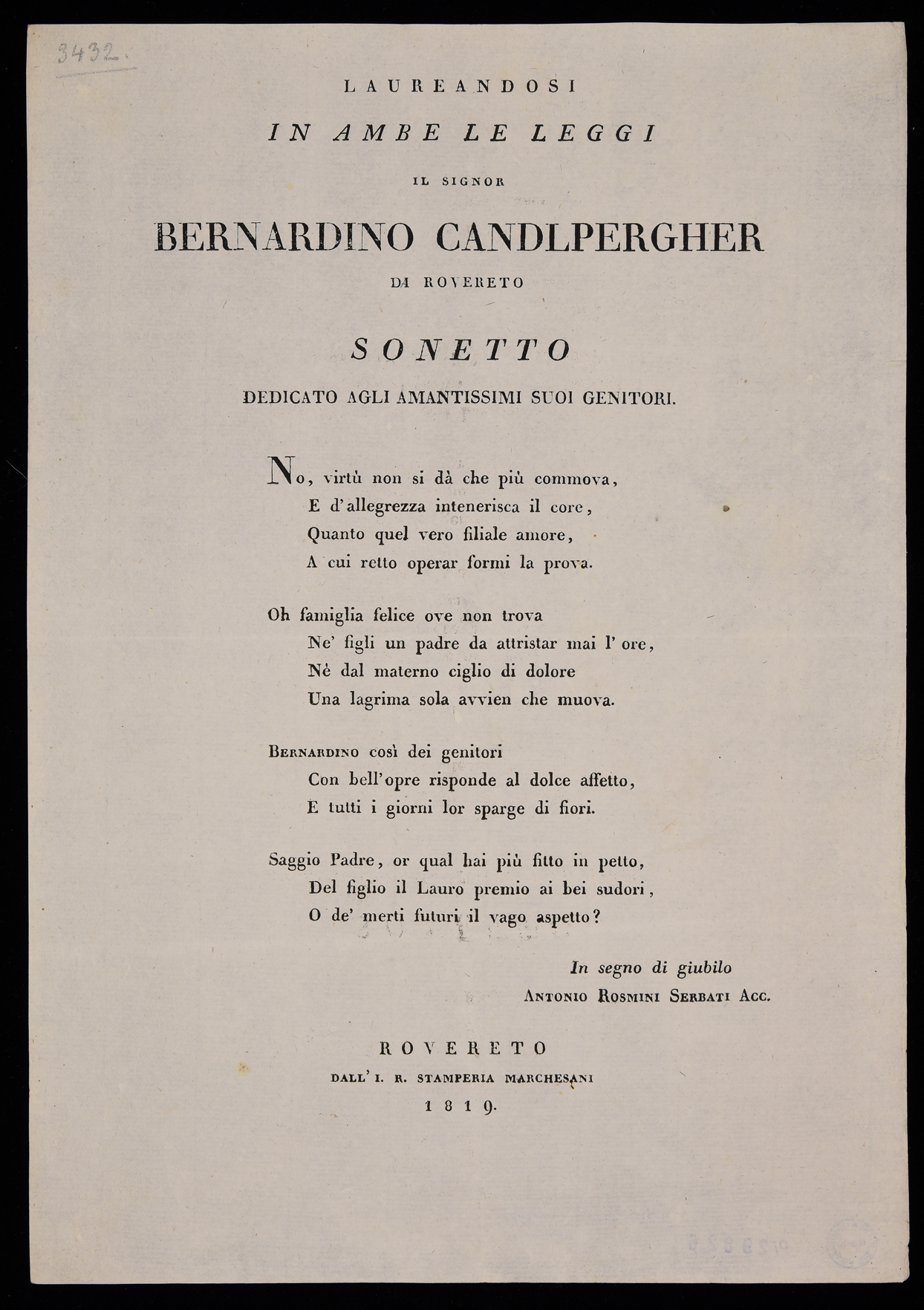 | Laureandosi in ambe le leggi il signor Bernardino Candlpergher da Rovereto, sonetto dedicato agli amantissimi suoi genitori |