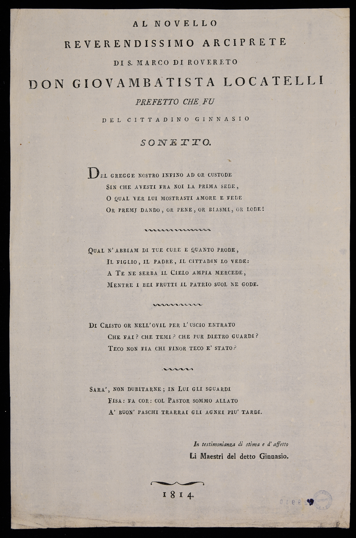 | Al novello reverendissimo arciprete di S. Marco di Rovereto don Giovambattista Locatelli prefetto che fu del cittadino ginnasio, sonetto |