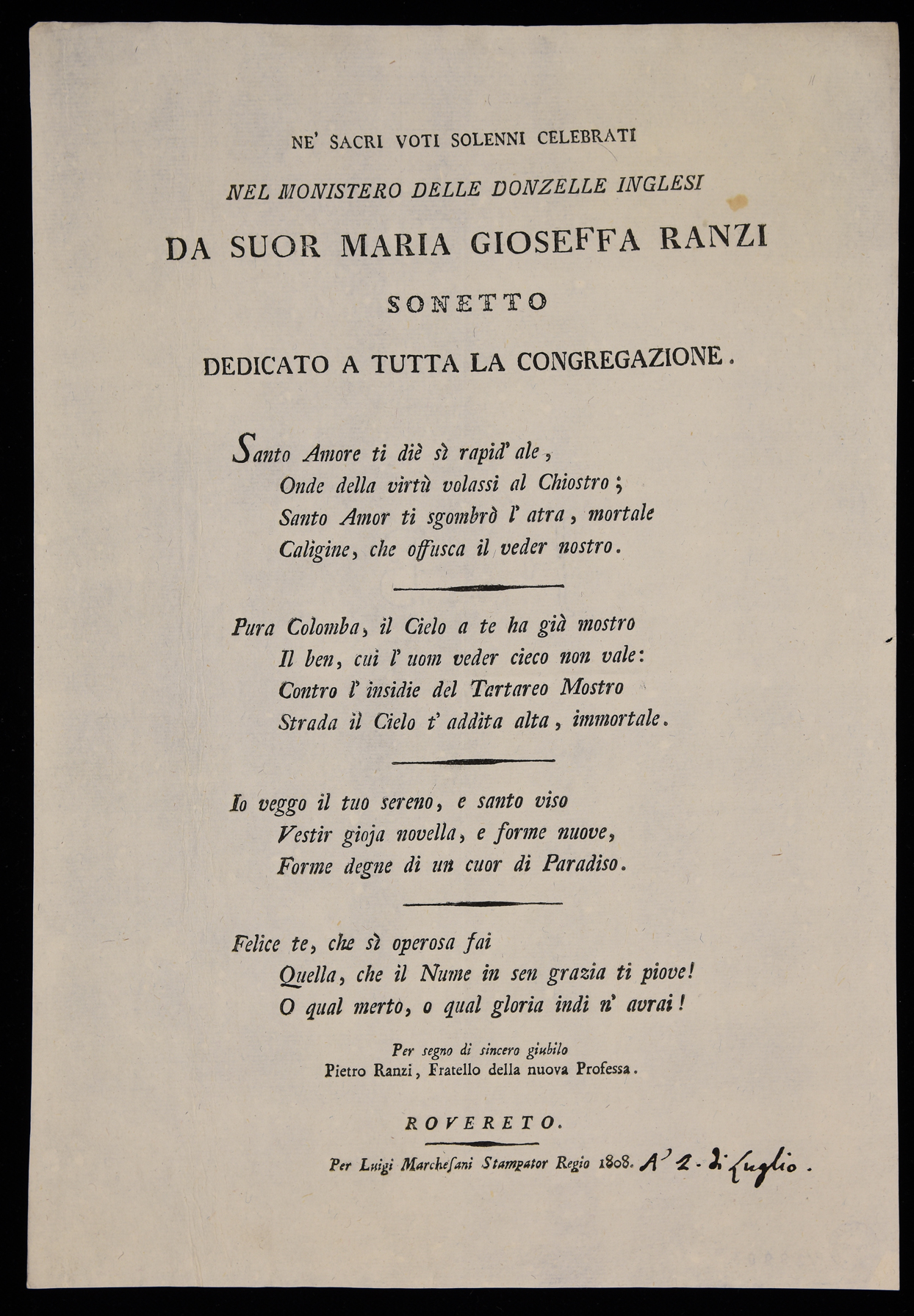 | Ne' sacri voti solenni celebrati nel monistero delle Donzelle Inglesi da suor Maria Gioseffa Ranzi, sonetto ... |