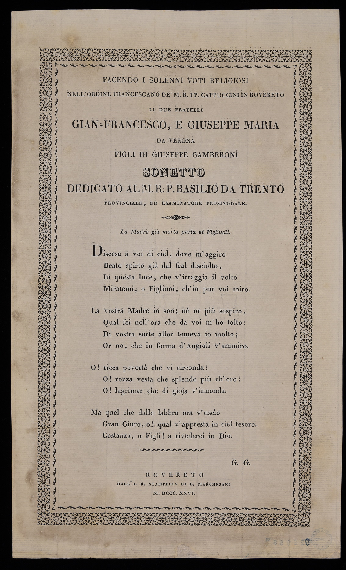 | Facendo i solenni voti religiosi nell'ordine Francescano de' M.R.PP. Cappuccini in Rovereto li due fratelli Gian-Francesco, e Giuseppe Maria ... sonetto ... |