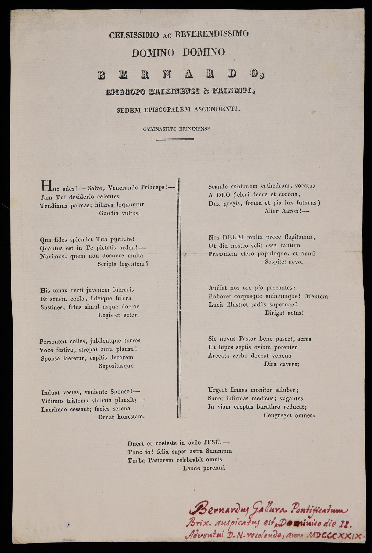 | Celsissimo ac reverendissimo domino domino Bernardo, episcopo Brixinensi & principi, sedem episcopalem ascendenti, Gymnasium Brixinense |