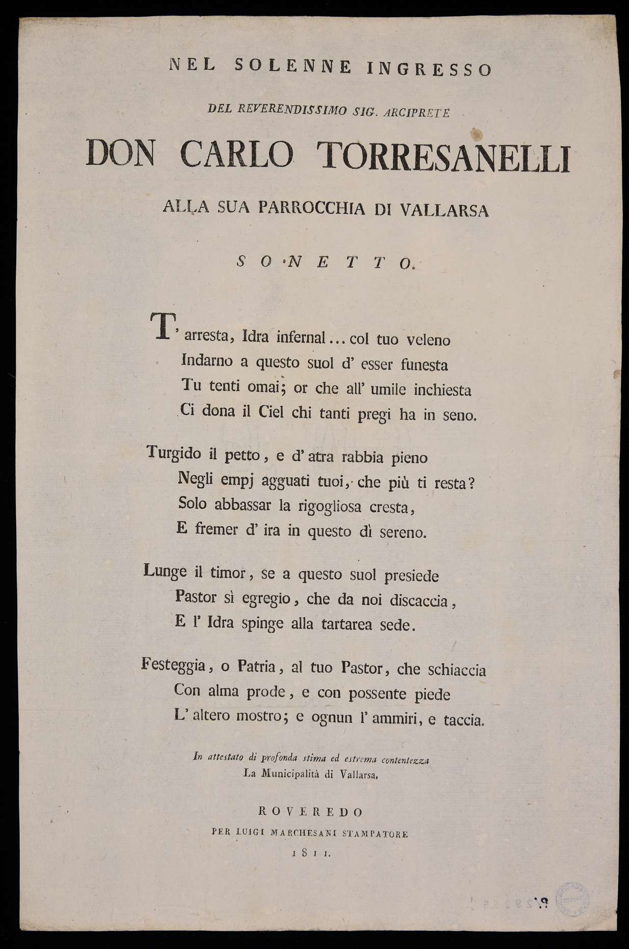 | Nel solenne ingresso del reverendissimo sig. arciprete don Carlo Torresanelli alla sua parrocchia di Vallarsa, sonetto |
