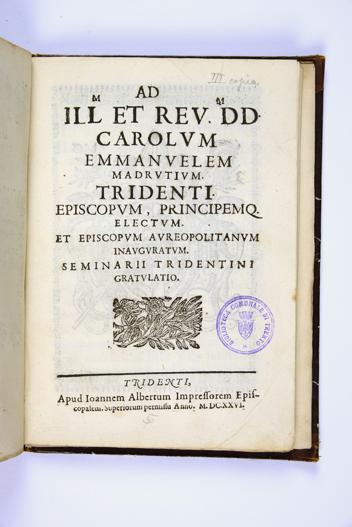 | Ad ill.m. et rev.m dd. Carolum Emmanuelem Madrutium Tridenti episcopum, principemq. electum. Et episcopum Aureopolitanum inauguratum. seminarii Tridentini gratulatio |