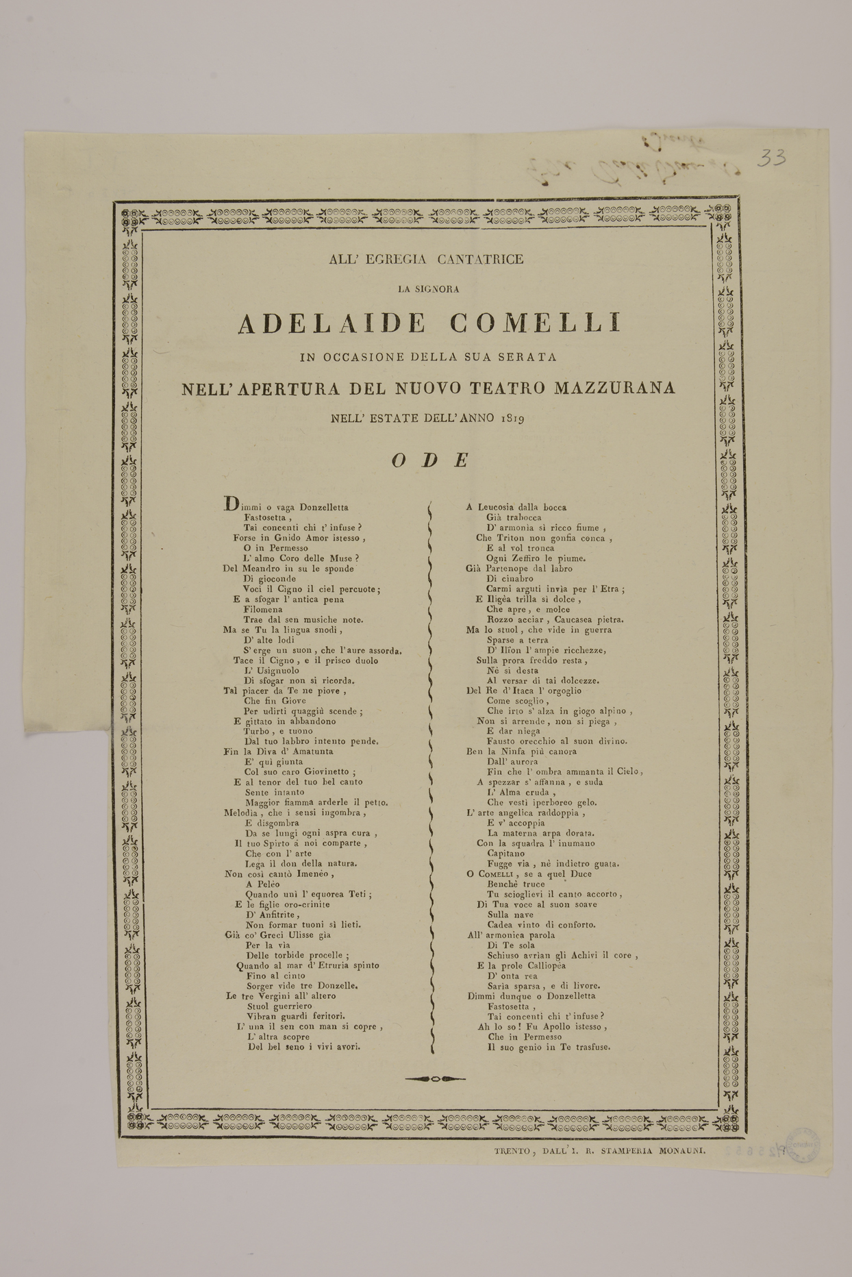 | All'egregia cantatrice la signora Adelaide Comelli in occasione della sua serata ... ode |