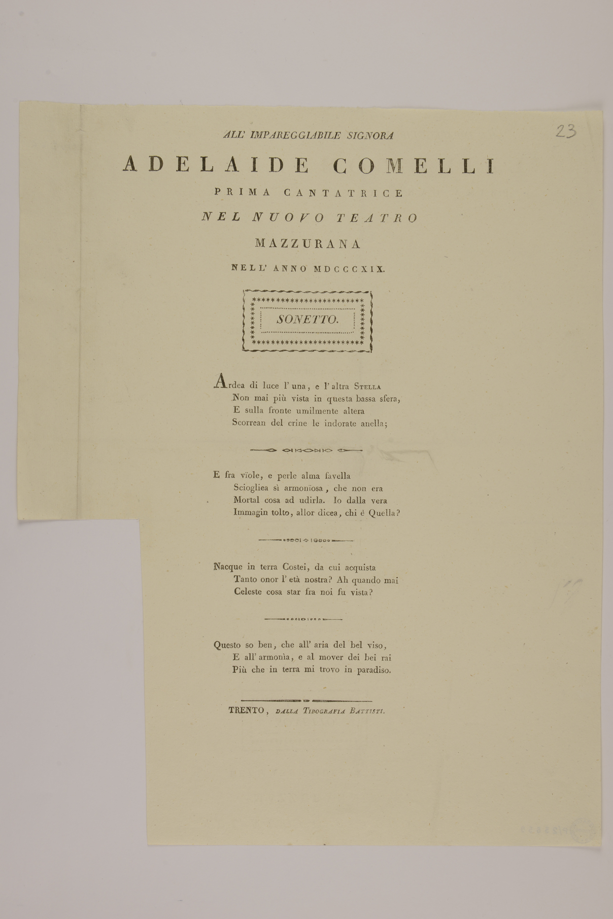 | All'impareggiabile signora Adelaide Comelli prima cantatrice nel nuovo teatro Mazzurana nell'anno MDCCCXIX., sonetto |