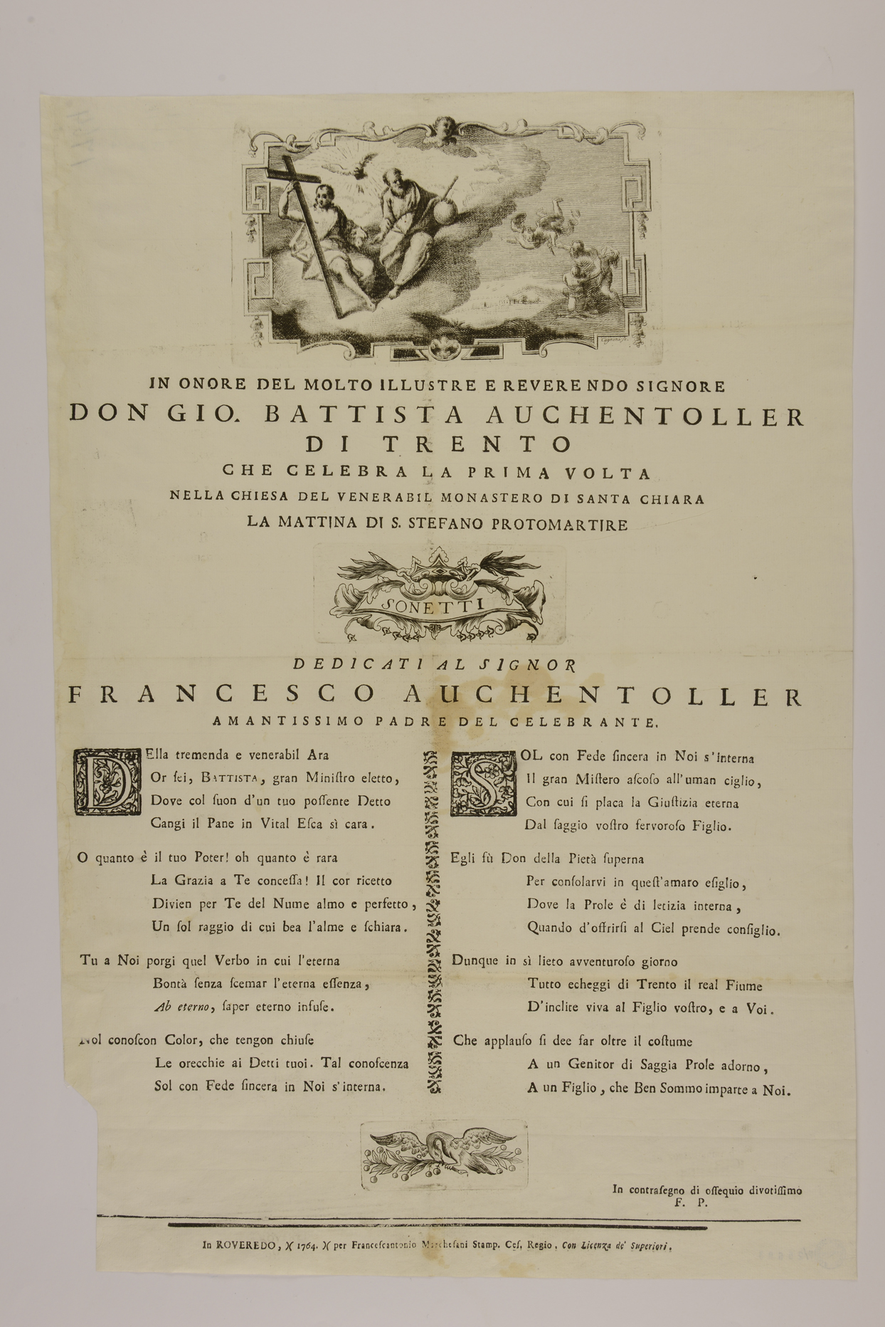 | In onore del molto illustre e reverendo signore don Gio. Battista Auchentoller di Trento che celebra la prima volta nella chiesa del venerabil monastero di Santa Chiara la mattina di s. Stefano protomartire sonetti |