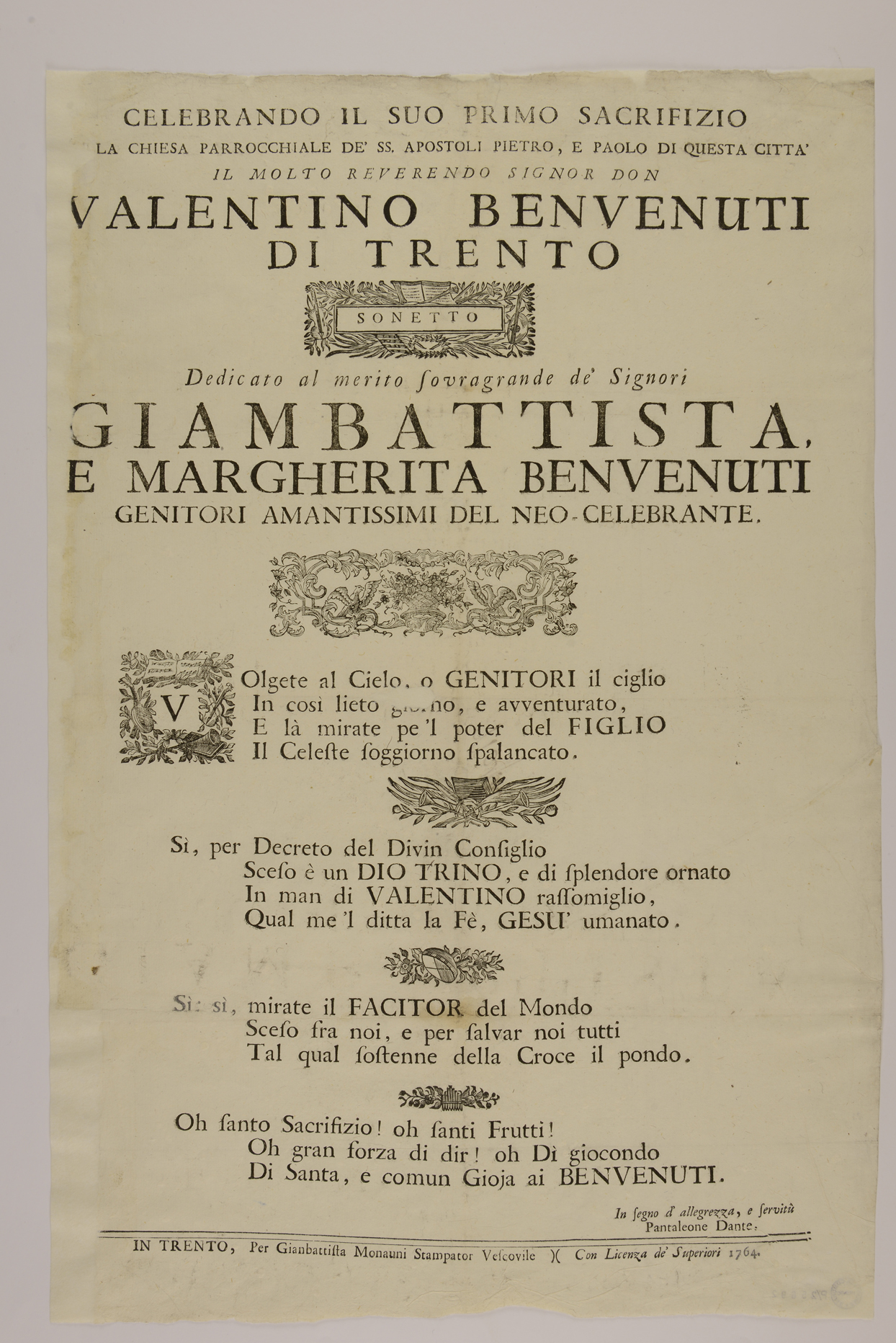| Celebrando il suo primo sacrifizio la chiesa parrocchiale de' SS. apostoli Pietro, e Paolo ... don Valentino Benvenuti di Trento, sonetto ... |