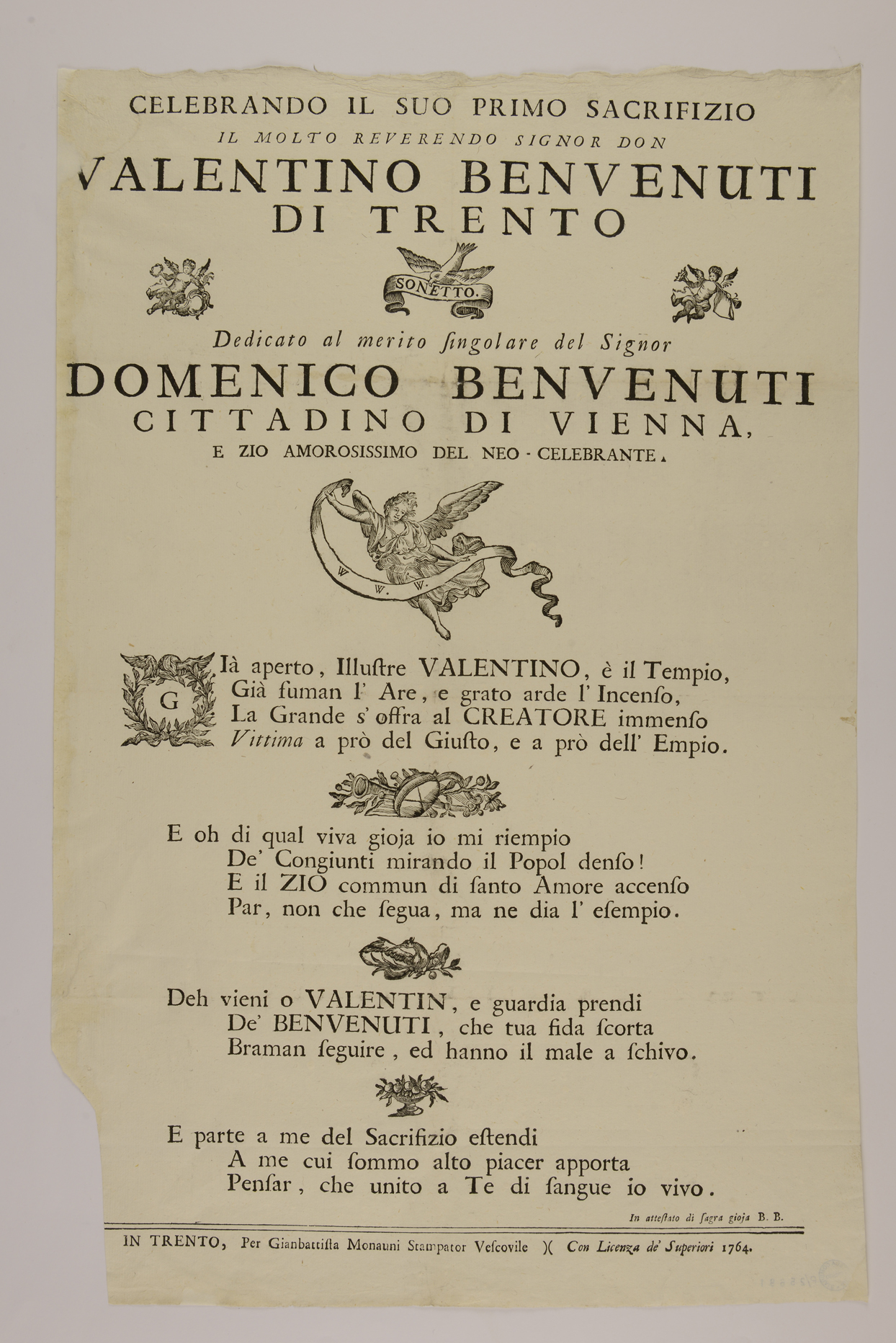 | Celebrando il suo primo sacrifizio il molto reverendo signor don Valentino Benvenuti di Trento, sonetto dedicato al merito singolare del signor Domenico Benvenuti cittadino di Vienna, e zio amorosissimo del neo-celebrante |