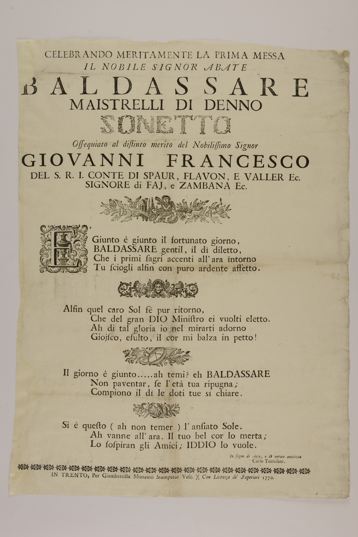 1 manifesto, atl., carattere romano e corsivo, iniziale xilografica, xilografie e fregi tipografici. Sonetto di Carlo Torresani dedicato al conte Giovanni Francesco Spaur in occasione della prima messa di Baldassarre Maistrelli.