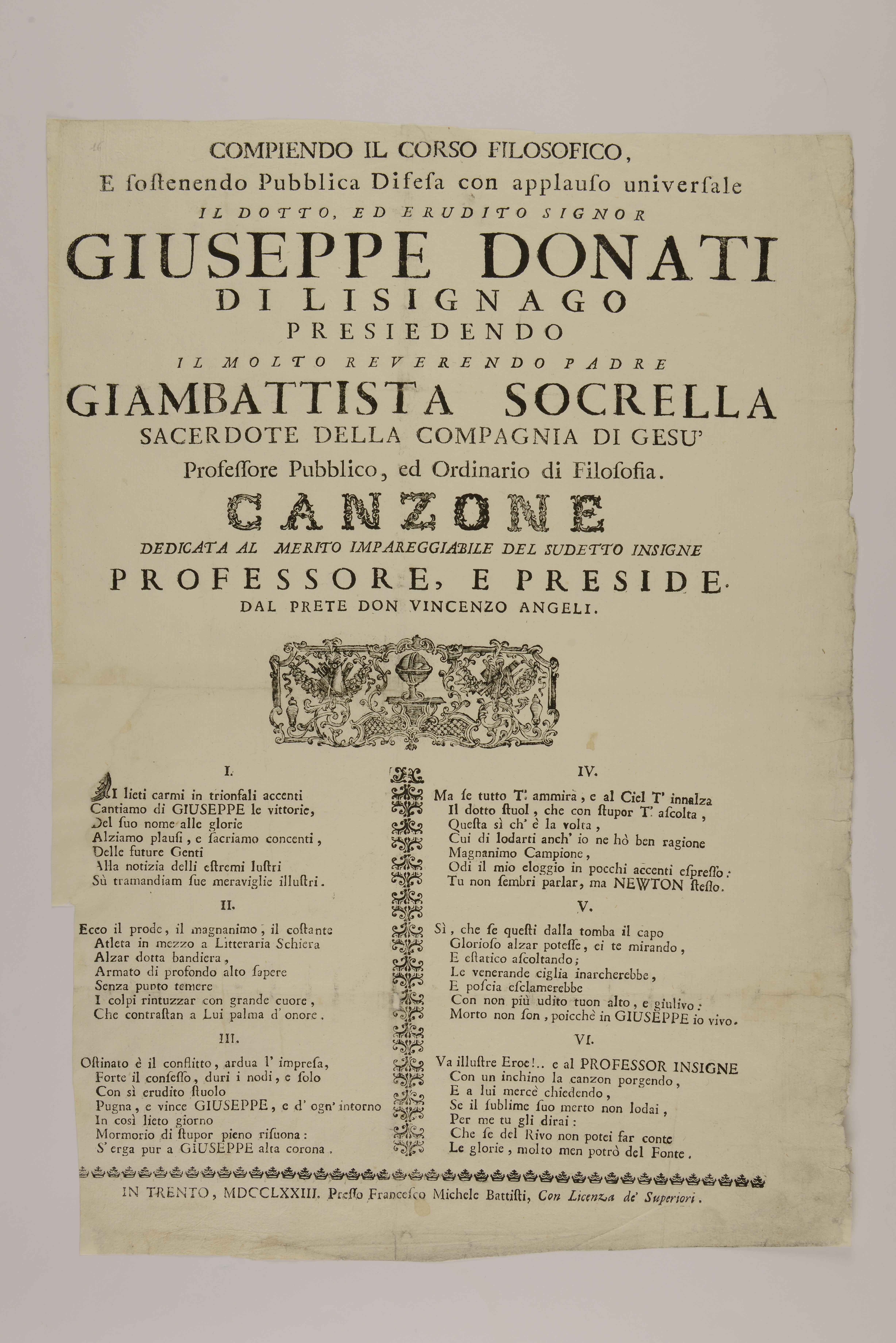 | Compiendo il corso filosofico e sostenendo pubblica difesa con applauso universale il dotto ed erudito signor Giuseppe Donati di Lisignago presiedendo il molto reverendo padre Giambattista Socrella sacerdote della Compagnia di Gesù professore pubblico, ed ordinario di Filosofia. Canzone dedicata al merito impareggiabile del sudetto insigne professore, e preside dal prete don Vincenzo Angeli |