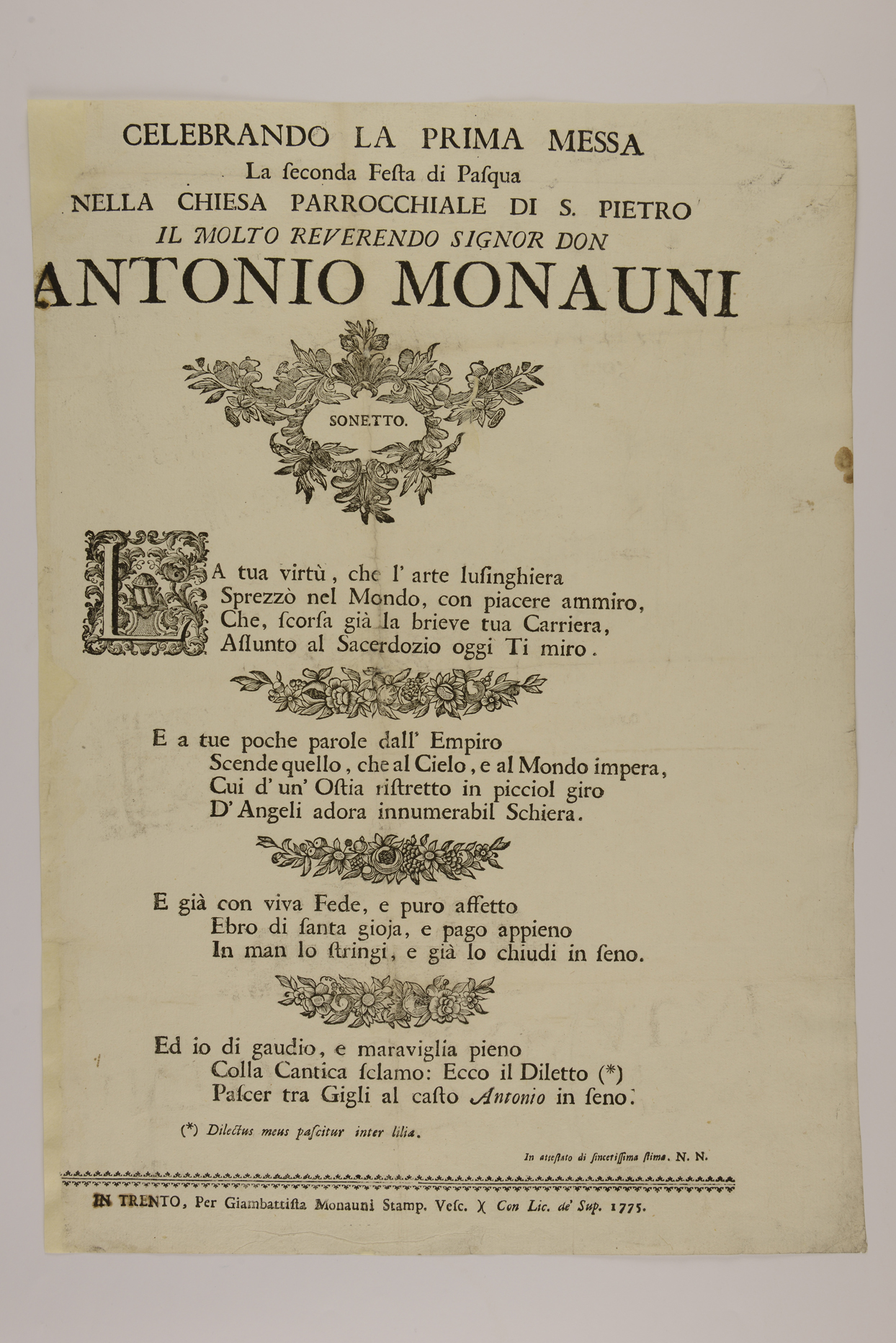 | Celebrando la prima messa la seconda festa di Pasqua nella chiesa parrocchiale di S. Pietro il molto reverendo signor don Antonio Monauni, sonetto |