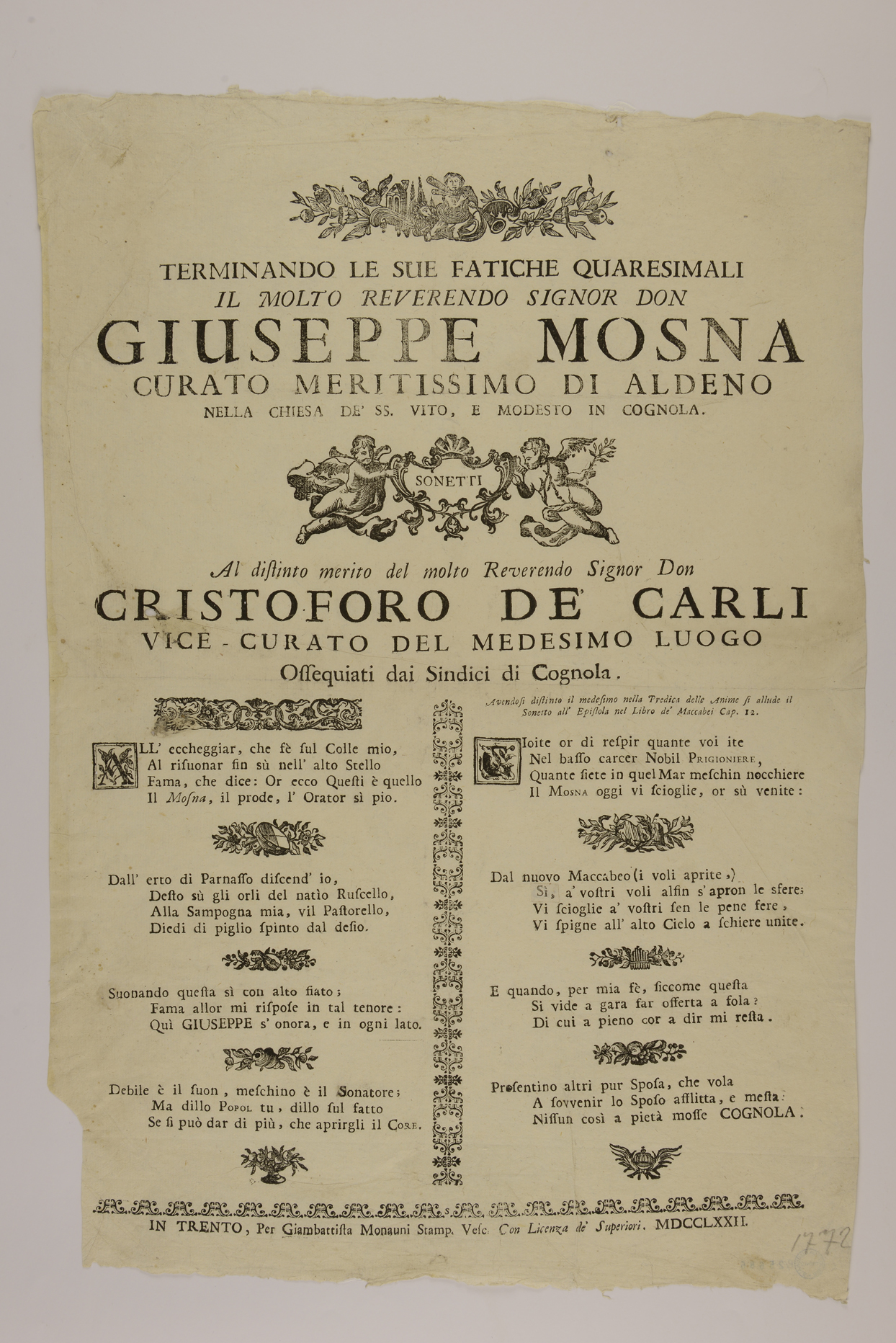 | Terminando le sue fatiche quaresimali il molto reverendo signor don Giuseppe Mosna curato ... sonetti ... |