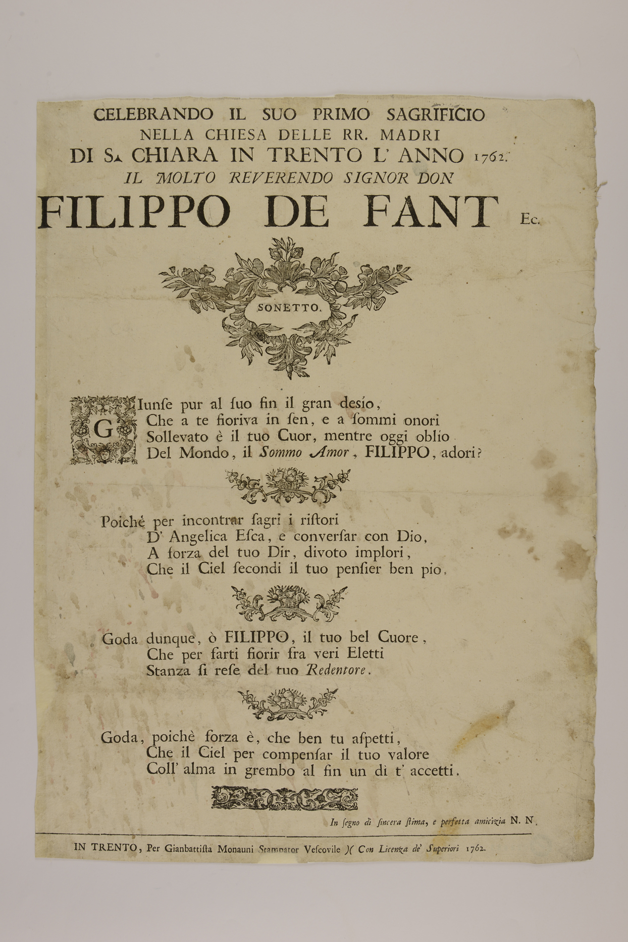 | Celebrando il suo primo sagrificio nella chiesa delle rr. madri di S. Chiara in Trento l'anno 1762. il molto reverendo signor don Filippo De Fant ec. Sonetto |