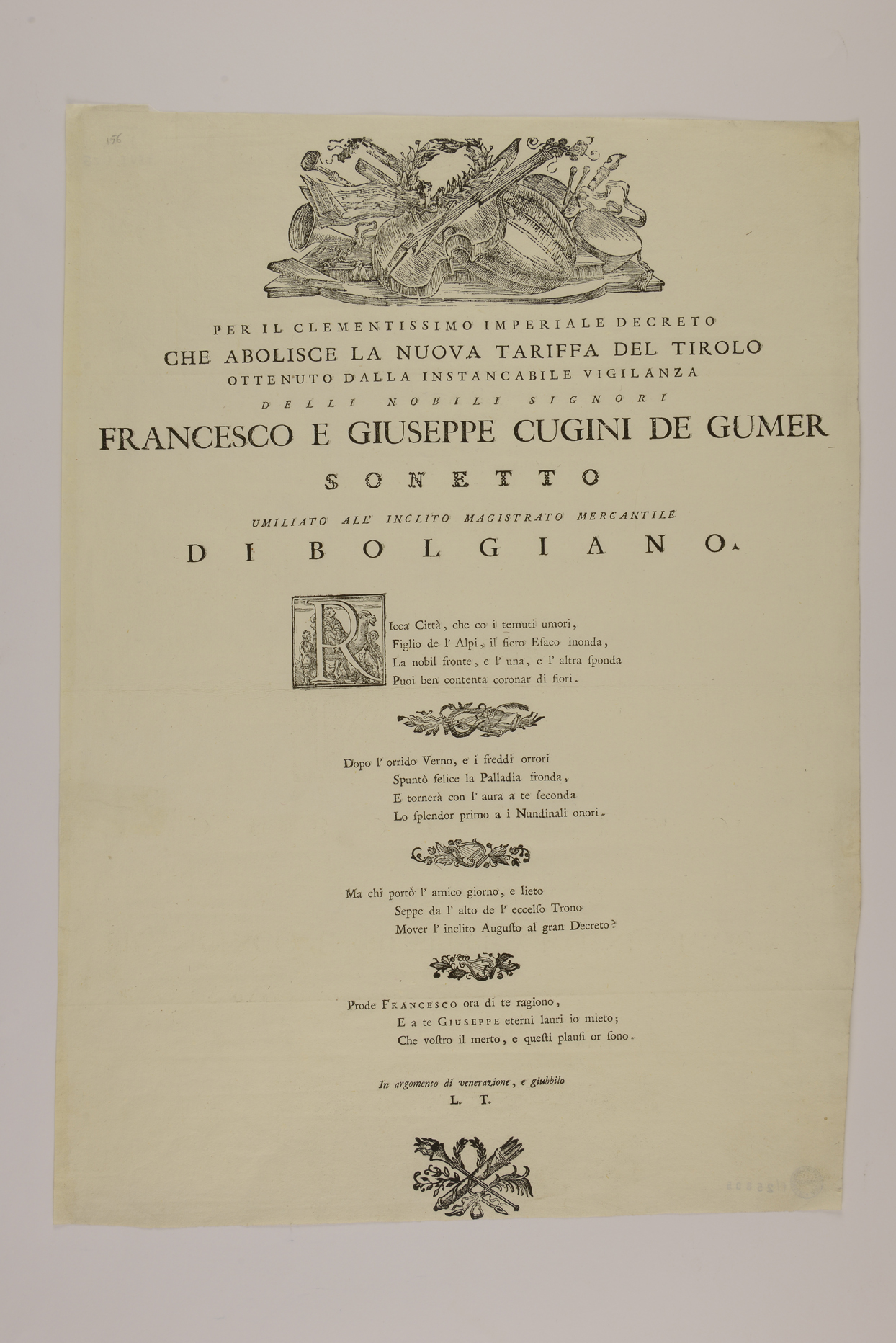 | Per il clementissimo imperiale decreto che abolisce la nuova tariffa del Tirolo ottenuto dalla instancabile vigilanza delli nobili signori Francesco e Giuseppe cugini de Gumer, sonetto ... |