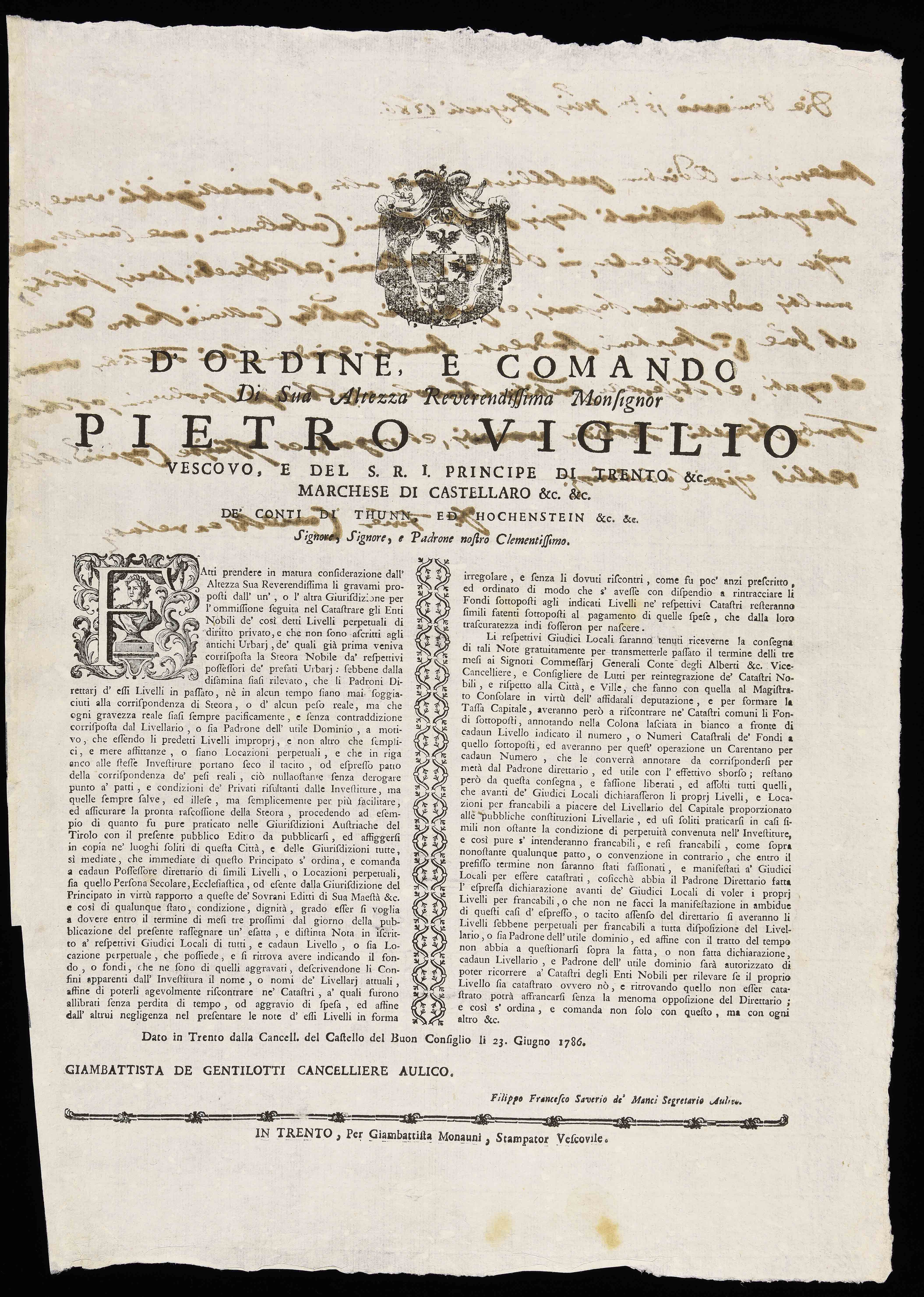 | D'ordine e comando di sua altezza reverendissima monsignor Pietro Vigilio vescovo e del S.R.I. principe di Trento &c. marchese di Castellaro &c. &c. de' conti di Thunn ed Hochenstein &c. &c. signore, signore e padrone nostro clementissimo |