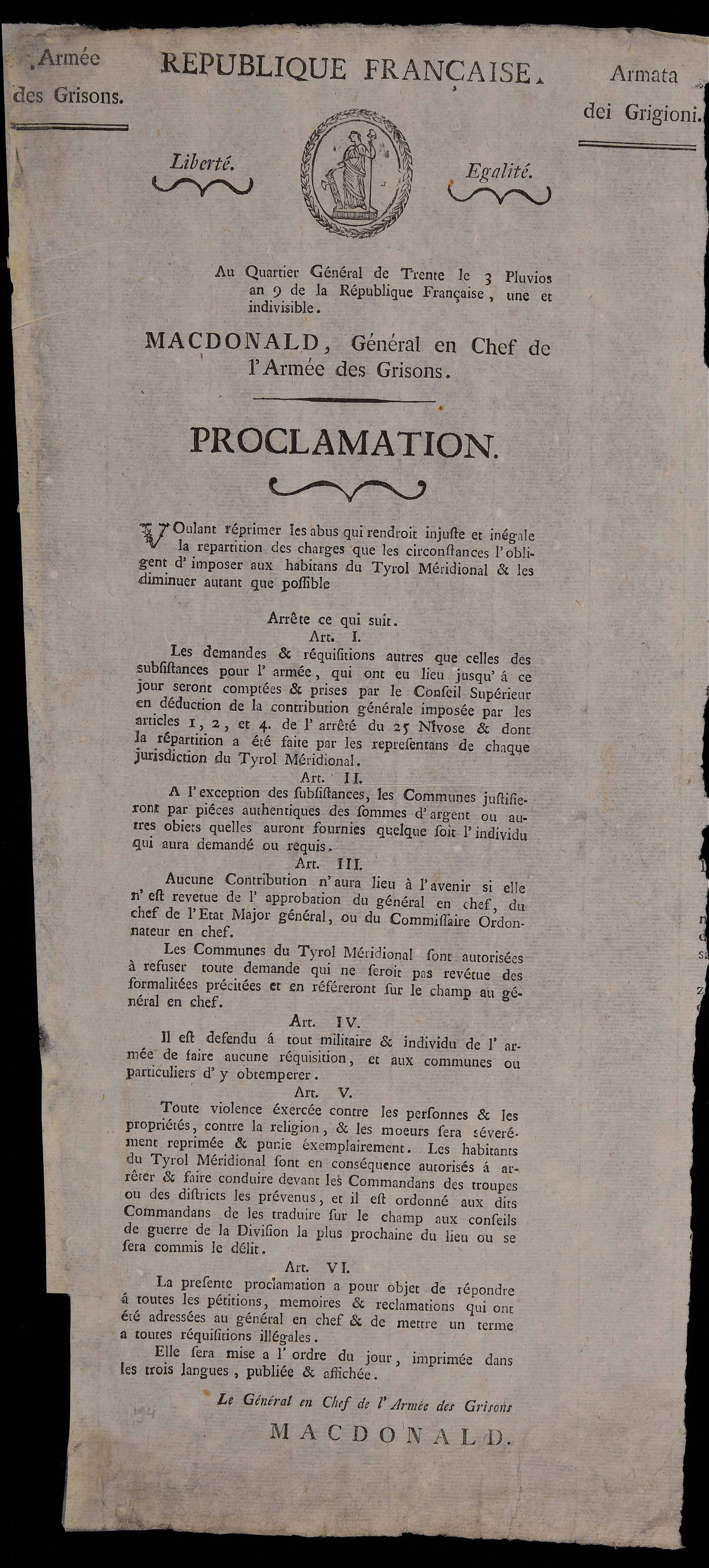 | Au Quartier général de Trente le 3 Pluvios, an 9 de la République Française une et indivisible : Macdonald, général en chef de l'Armée des Grisons : proclamation = Im Haupt-Quartier zu Trient den 3 Pluvios im 9ten Jahre der Republick : Macdonald general en Chef der Graubünder Armee : proclamation |